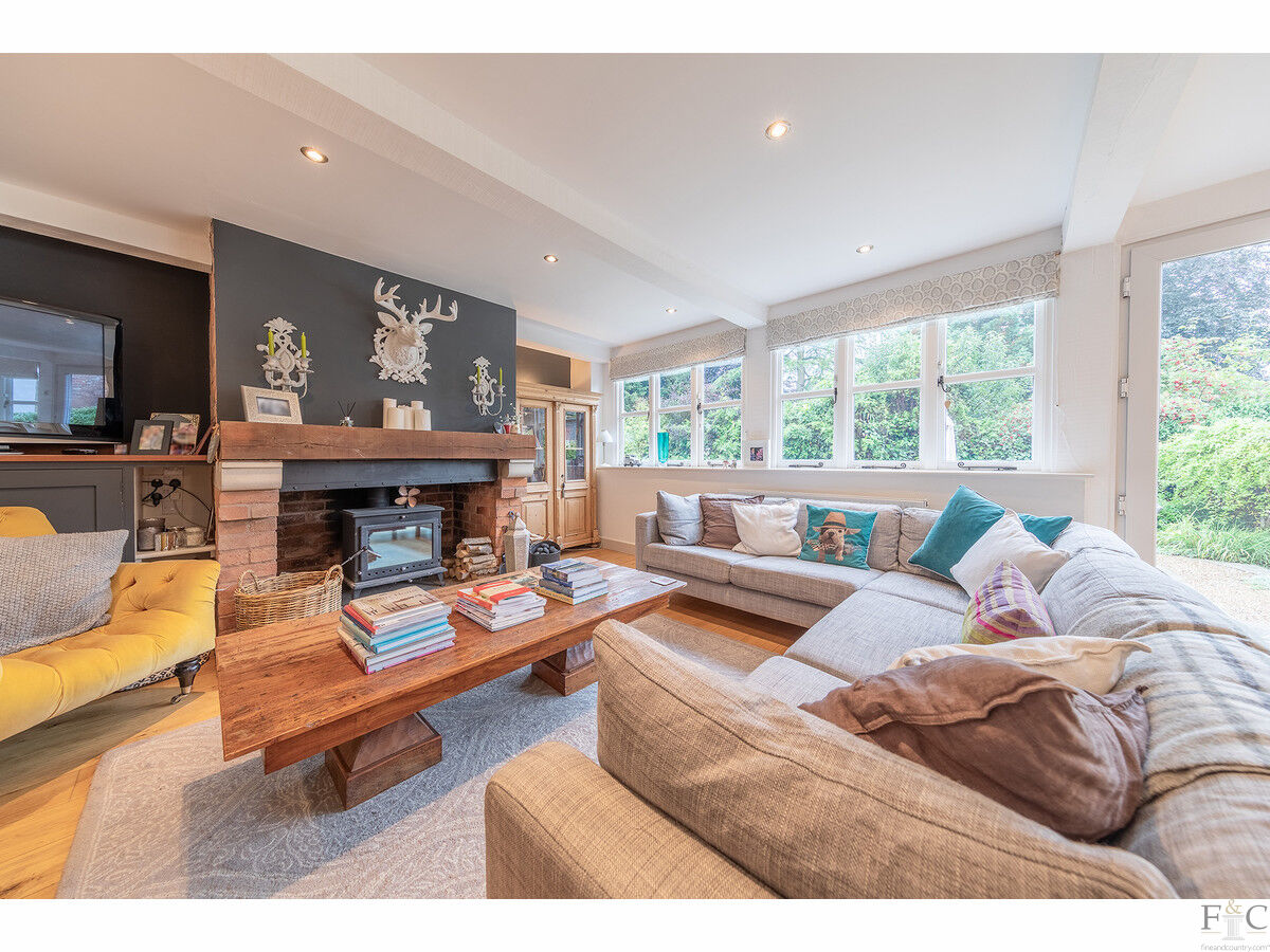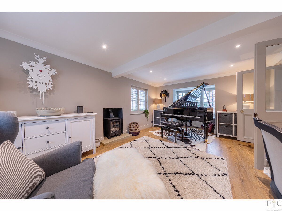 Off the hallway, the triple-aspect music room is a light-filled retreat, featuring a gas stove and offering flexibility as a study, playroom, or additional lounge. The formal lounge, with its striking exposed chimney breast and wood-burning stove, provides a cosy yet spacious setting for relaxation.