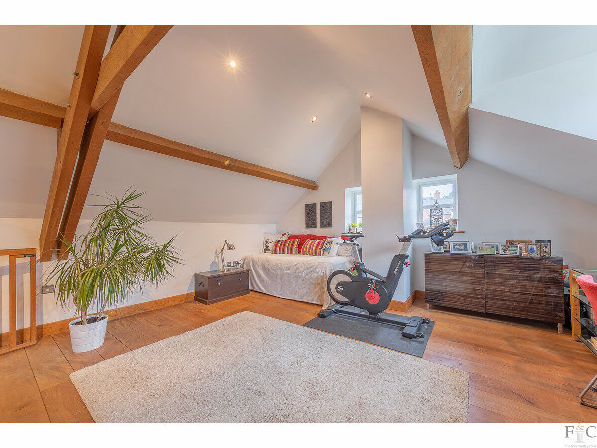 The first floor offers a flexible and well-balanced layout, accessed via the main dog-leg staircase and a secondary spiral staircase from the open-plan living area.