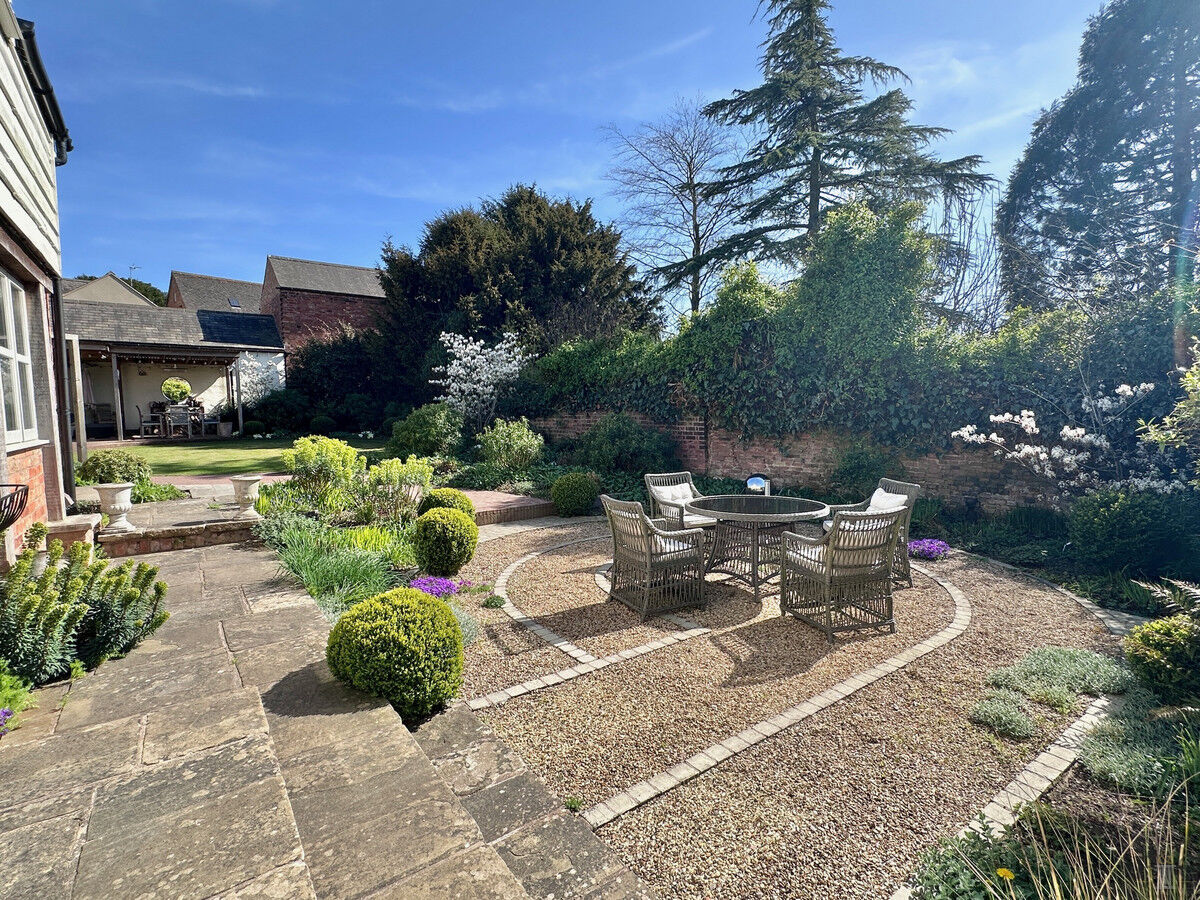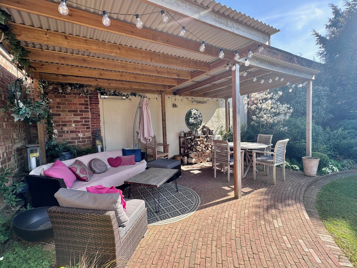 The garden also includes a generous brick store and a covered dining area, making it a sophisticated entertaining space for summer parties and a perfect sanctuary to enjoy with family and friends.