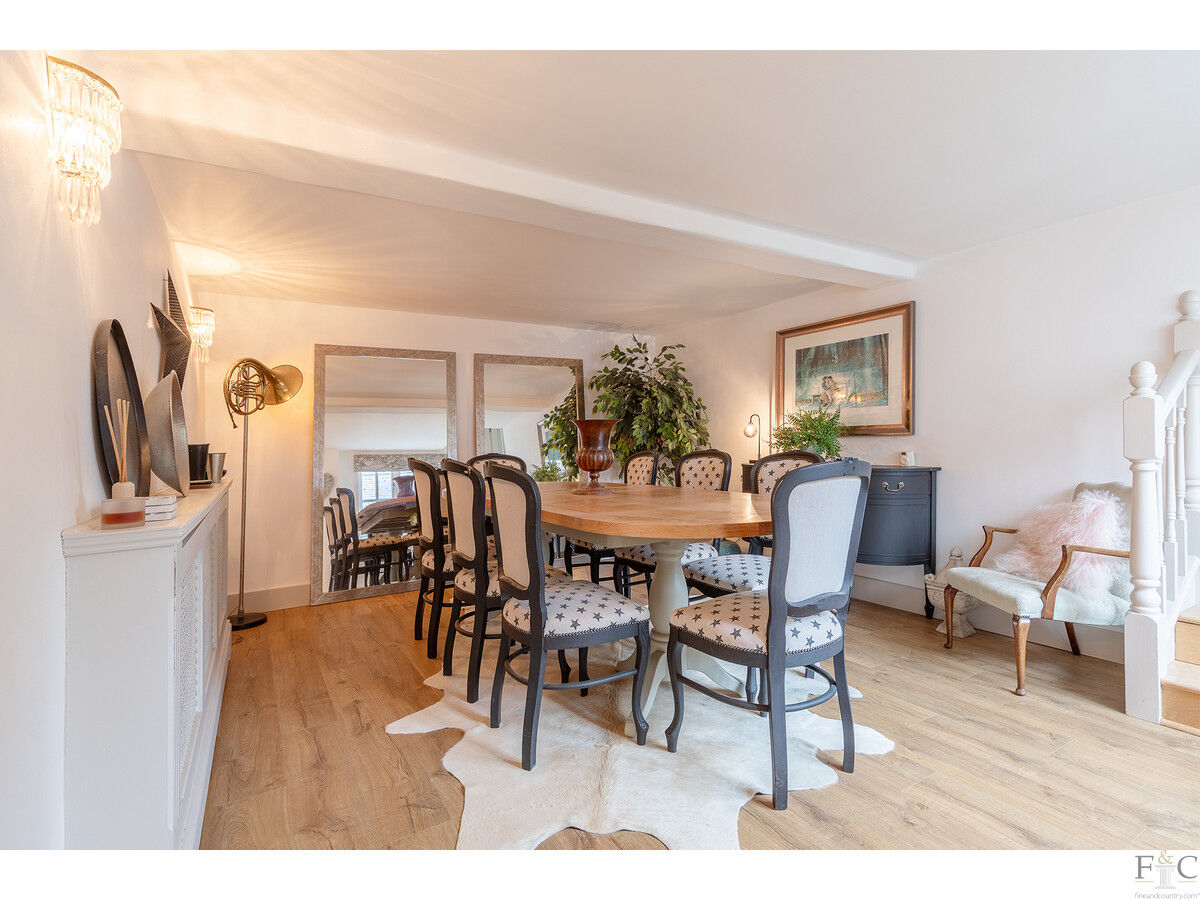 Overlooking the gardens, the kitchen is beautifully designed with bespoke handmade cabinetry, a large central island, and an Aga, creating a warm and sociable heart of the home. Large, glazed windows run along one side, filling the space with natural light, while a relaxed seating area with a wood-burning stove enhances the sense of comfort. French doors open onto a gravelled terrace, perfect for morning coffee or alfresco dining.