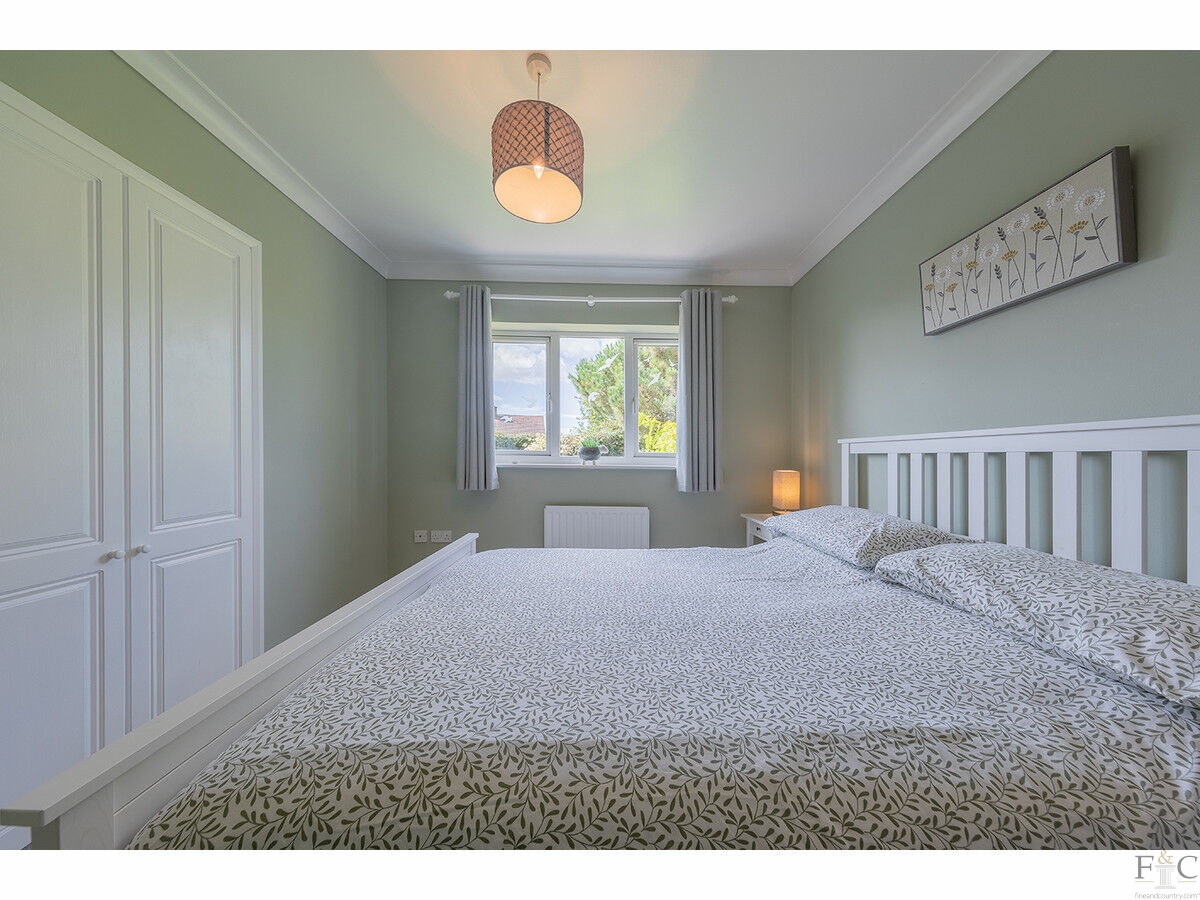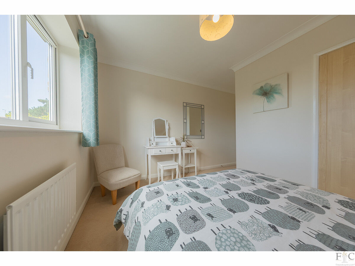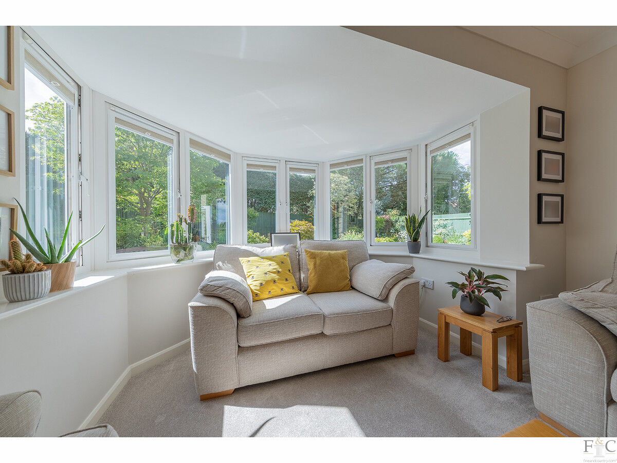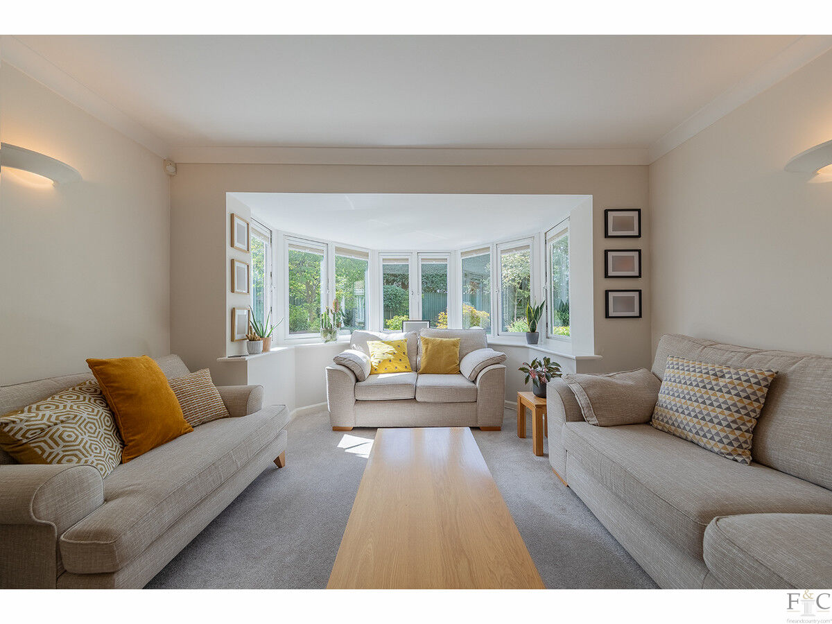 The spacious lounge towards the rear of the property is clearly the most delightful room to be able to relax in, enjoying views into the garden through a bay window that creates the impression of a sunroom. Here the focal point is a white fireplace with mantel and hearth that beautifully combines the traditional characterful feature of a fireplace with the smooth sleekness of a contemporary equivalent. The lounge is carpeted and has wall lights, with bespoke fit to frame blinds fitted to each pane of the bay window. It is a generously proportioned room and easily accommodates large sofas and chairs.