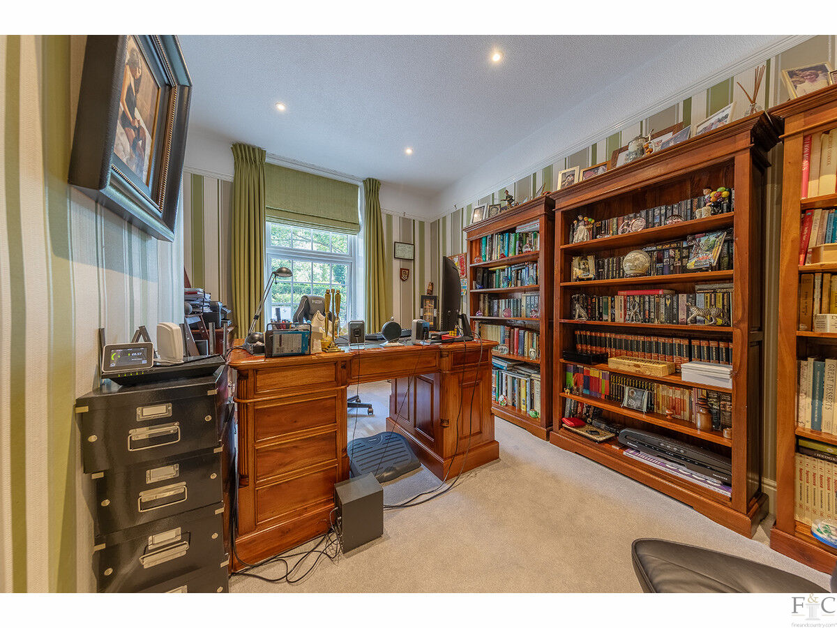 The dining room has a fireplace housing a dual fuel fire and easily accommodates a table suitable for formal entertaining. However, it has been cleverly designed to link by glass doors to a spacious and airy conservatory and presents multiple options for entertaining while being surrounded by the lush green of the garden and open skies above. The conservatory is a fantastic addition to the property and provides a light, relaxing room from which to entertain and enjoy the garden all year round being heated and fitted with blinds. It is also within easy access of the swimming pool and gym facilities.