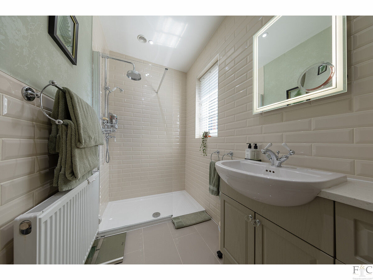 Originally the parish room, the first reception room has a large, canted bay window and fireplace, with gas fire. With dual perspectives, this spacious carpeted room has sunken ceiling lights and large windows. Next door, the lounge is similarly carpeted and has a dual fuel fire (wood or coal) within the fireplace. The study and cloakroom are at the end of the hallway. Comprising of a white two-piece toilet and basin vanity unit with contrasting chocolate brown metro tiling, the sanitary fixtures and fittings within The Old Rectory are presented and maintained to a high standard throughout. This is the first of four bathing facilities that have been supplied and equipped with stylish yet contemporary components offering fresh, luxurious ensuite shower rooms and a delightful family bathroom.