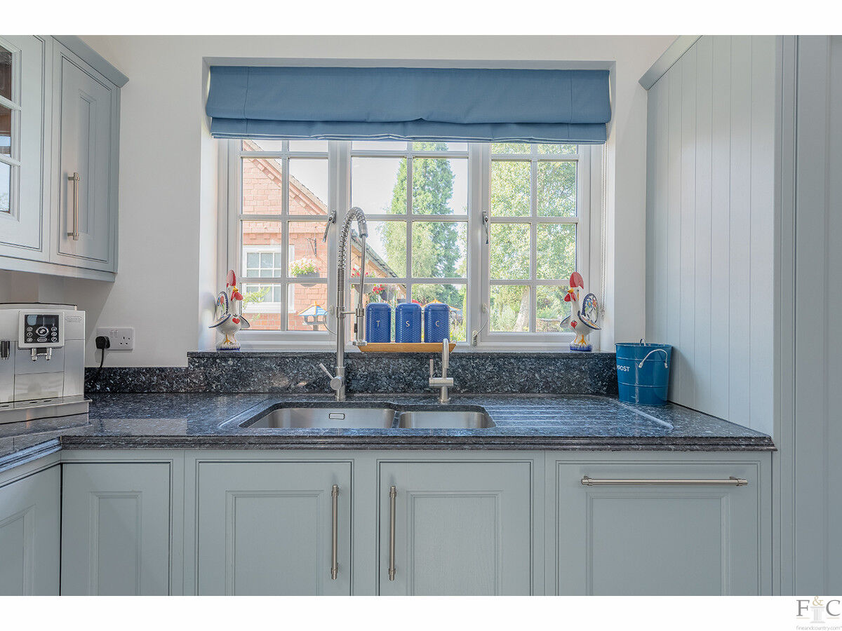 The heart of the house is often said to be the kitchen and here the kitchen is central within the home and beautifully designed. Ample storage and display space is provided by Shaker style cabinetry in contrasting cornflower blue and old navy accessorised with temporary brushed steel bar handles. Integrated appliances include a Miele dishwasher and an imposing black SMEG oven sits within a recessed, bespoke unit with high mantel shelf and flanked by side cupboards, reminiscent of a kitchen range. Above the seven-burner gas hob, a Bosch canopy extractor fan ensures ventilation, with two fan-assisted electric ovens and a separate grill completing the cooking facilities. The oven has a black and grey speckled splash back and matches the granite worktops above the central island unit and running under the wall units. Four pendant Hager industrial lighting fixtures hang above the island, and it provides the perfect location for breakfast or a coffee while admiring the views into the garden. Likewise, the position of the sink unit beneath one of the three windows permits garden gazing. Additional features include a Franke waste disposal unit, a Swiss Pro steaming hot and cold filtered water tap, two Neff refrigerators, a Neff four drawer freezer and a practical two-drawer bin cupboard discreetly housed beneath the island.