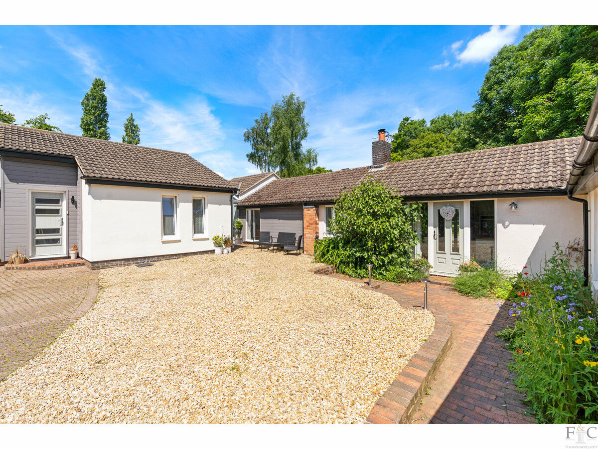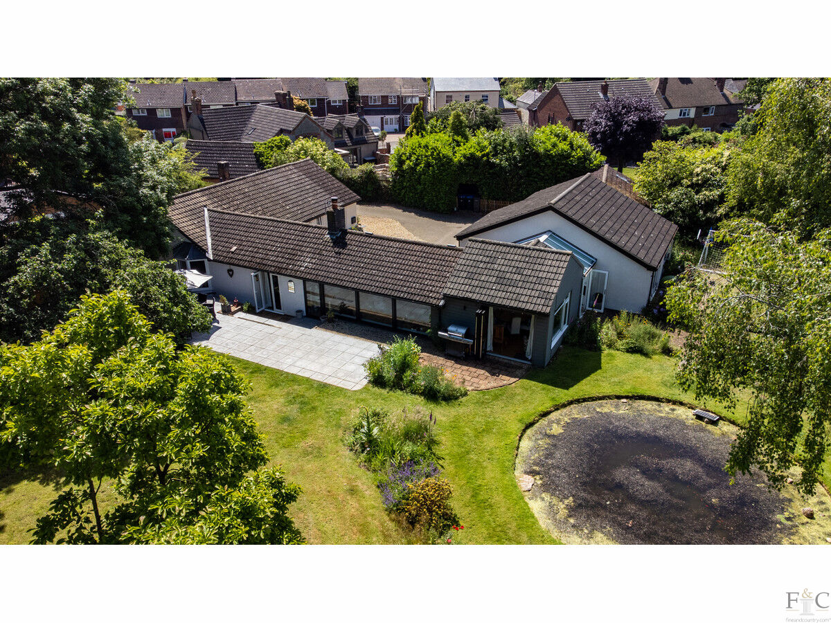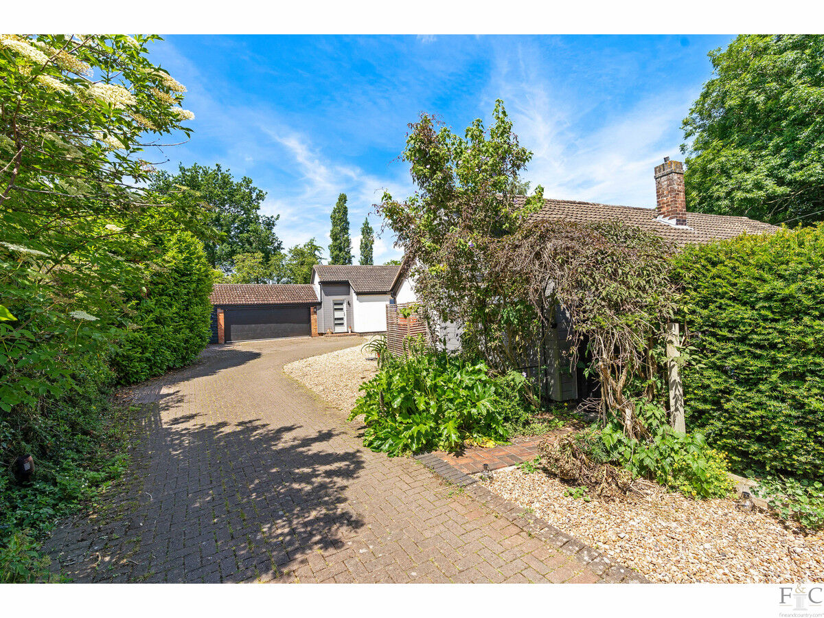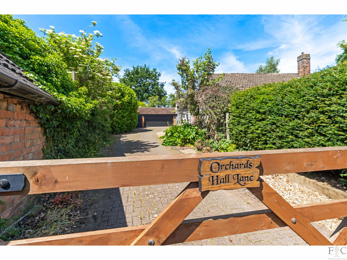 This property exudes quality, strength of design and attention to detail from the very first glance. When approaching from Hall Lane this bungalow is framed with mature trees and shrubs, giving it an air of privacy and beauty that leads the eyes down the curved but widening private drive. Here, the spacious herring boned patterned, blocked and shingled frontage leads to Orchards; a most desirable and highly original home.
