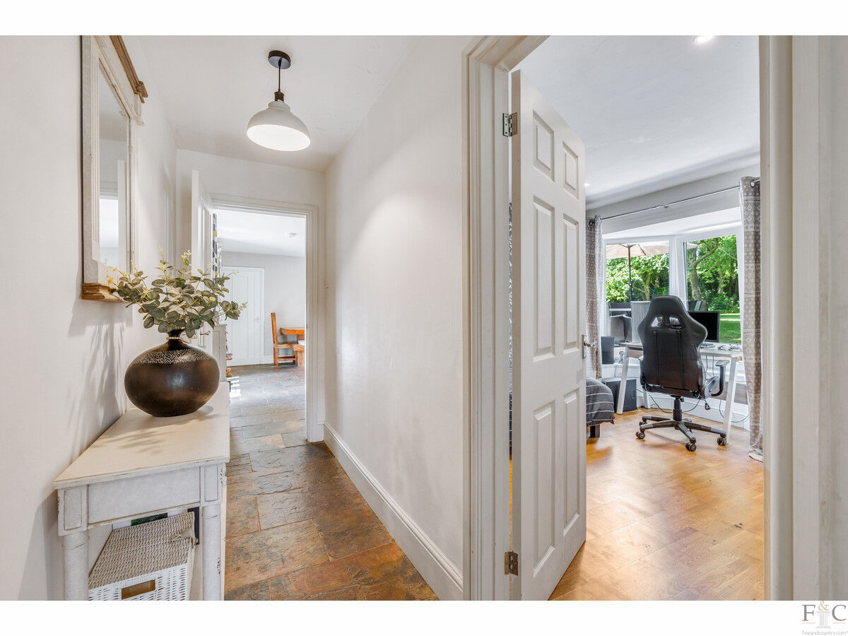 As you walk from the drive into the kitchen, the airiness and space is invocative of the impression you will gain throughout this property. This is not only due to the crisp lines and distinctive interior decoration throughout, but primarily the windows. They reach from ceiling to floor, flooding the kitchen and adjoining reception rooms with light and presenting the gardens in all their glory. This property is not named ‘Orchards’ without cause: in this home you will always have a green vista to appreciate through your window pane, whether garden or farmland landscape.