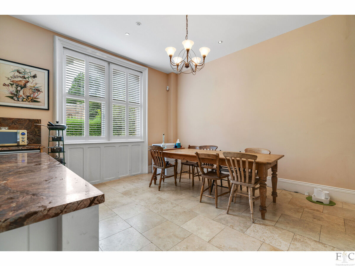 Returning to the hall, pop next door to discover the formal dining room, where ornate, original features mix with bold design to add yet more grandeur. A duo of sash windows deliver the outdoors in via the perfectly private garden, filling the room with natural light. There is room for the biggest of tables and is ready to host any number of celebrations, get-togethers and dinner parties.