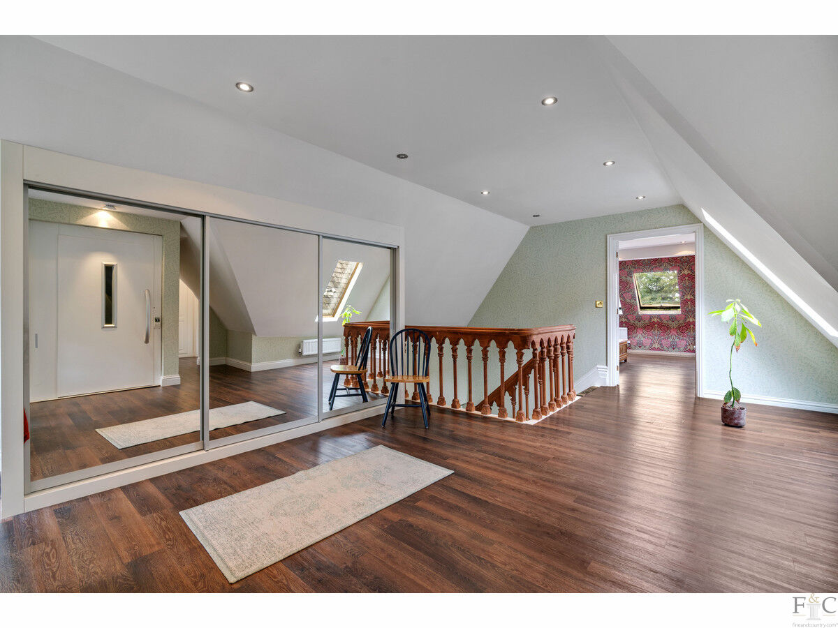 Nip up to the second floor and open the door to the spacious master suite, where the large Dormer windows capture the delightful views out over the countryside and beyond. There is ample room for the biggest of beds and matching furniture. Bold, bright tones by day turn to cosy, restful ones by night. The well-designed en suite is a truly stylish addition and the huge landing/dressing area (complete with elevator from the ground floor) creates the most impressive space. Bedroom two, with views towards the front of the property is a great sized double bedroom or home office space perhaps.