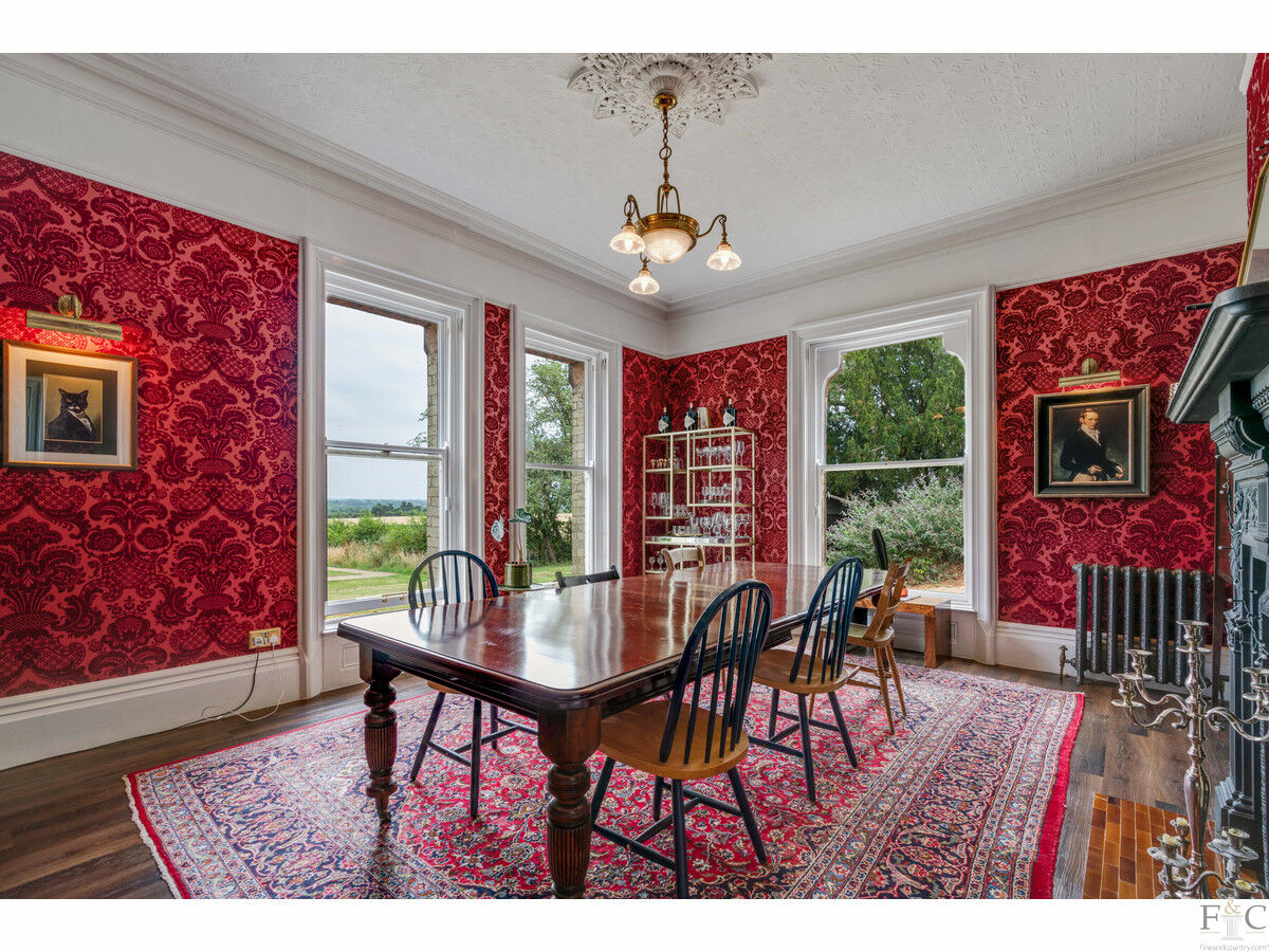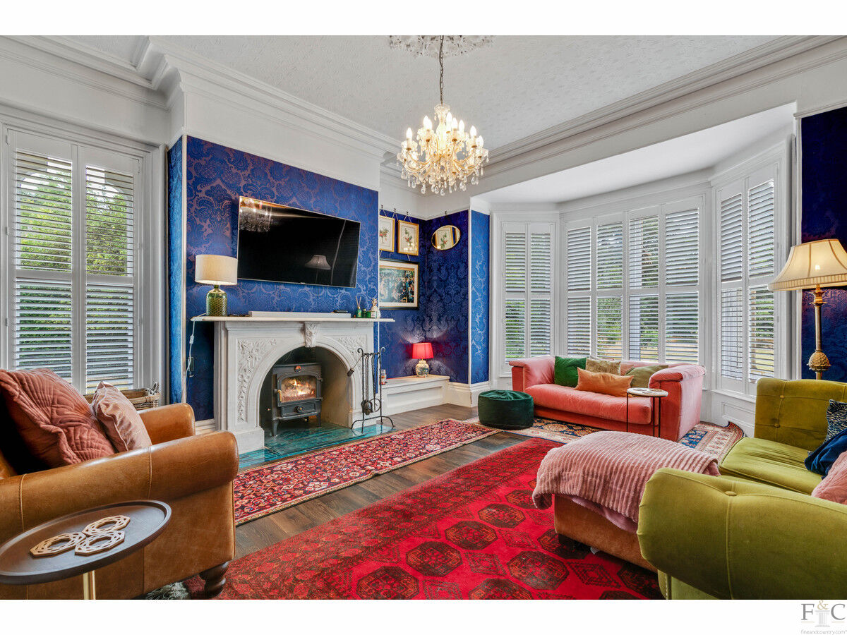 The living room, with its dual aspect windows, shares wonderful views over the side and rear of the property and beyond. There is room for the largest of sofas too, and the feature fireplace makes this space cool, inviting and perfect for those evenings in or for entertaining. Tastefully bold tones and more restored period features give this room a real sense of Victorian refinement seen and felt throughout this home.