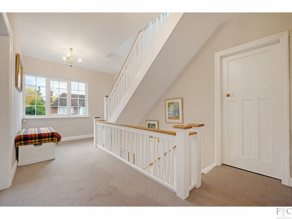 Returning to the hall, pop up the original wooden staircase to the first-floor landing. Here you will find four bedrooms (one with en suite shower room, two others with their own sink) and family bathroom.