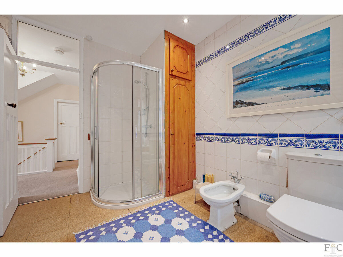 The well-appointed family bathroom is able to accommodate the busiest of morning routines. Tones of blue and a separate shower sit alongside a four-piece suite and storage, ensuring that space is maximised without cramping on style.