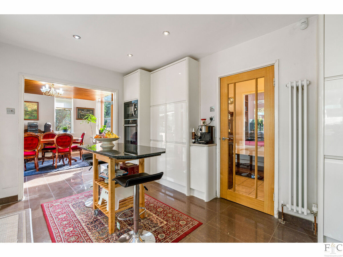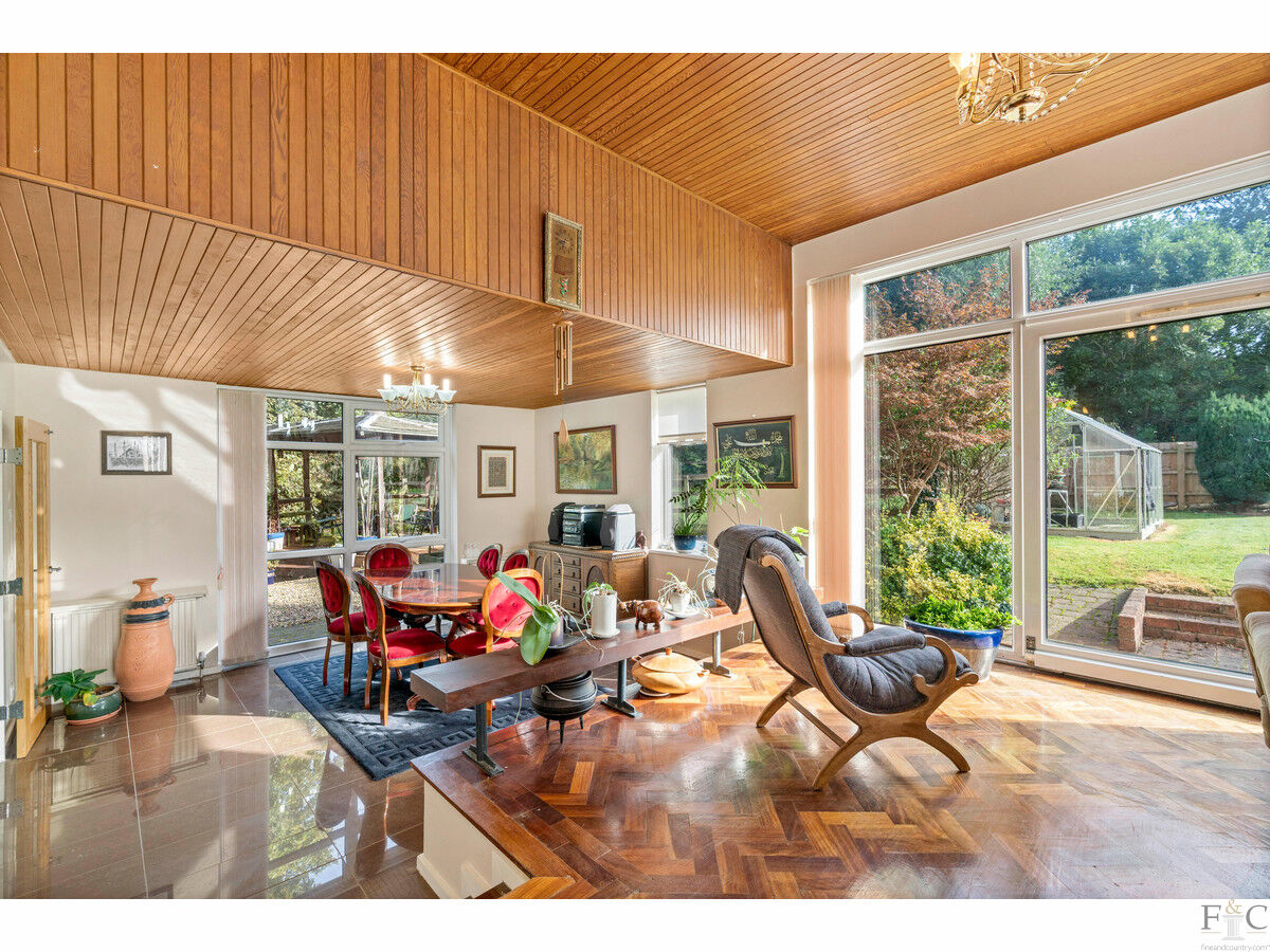 The split level sitting/dining room to the rear of the house is full of light, with floor to ceiling windows and patio doors looking onto the garden. This space stretches across the whole length of the property, giving great potential for entertaining or simply losing oneself in the peaceful atmosphere whilst being inspired by the view outside. There is plenty of room for the largest of dining tables – and with access directly into the kitchen it is a really practical, well used space. Up a couple of steps is the sitting area with its beautiful parquet flooring. There is a lovely, calm feeling to this space, with greenery seen through every window, it brings that lovely idea of the outdoors, indoors to life.