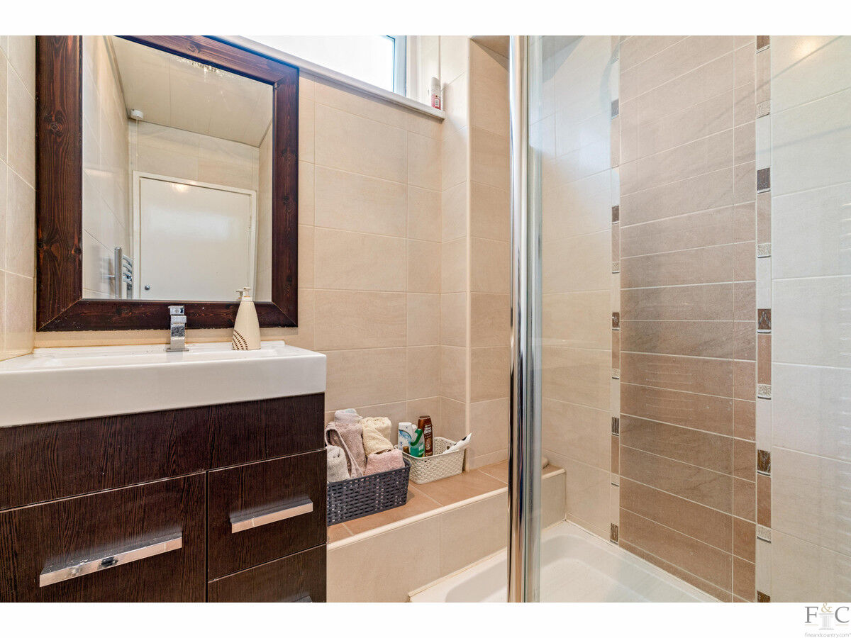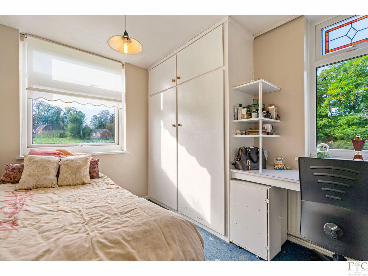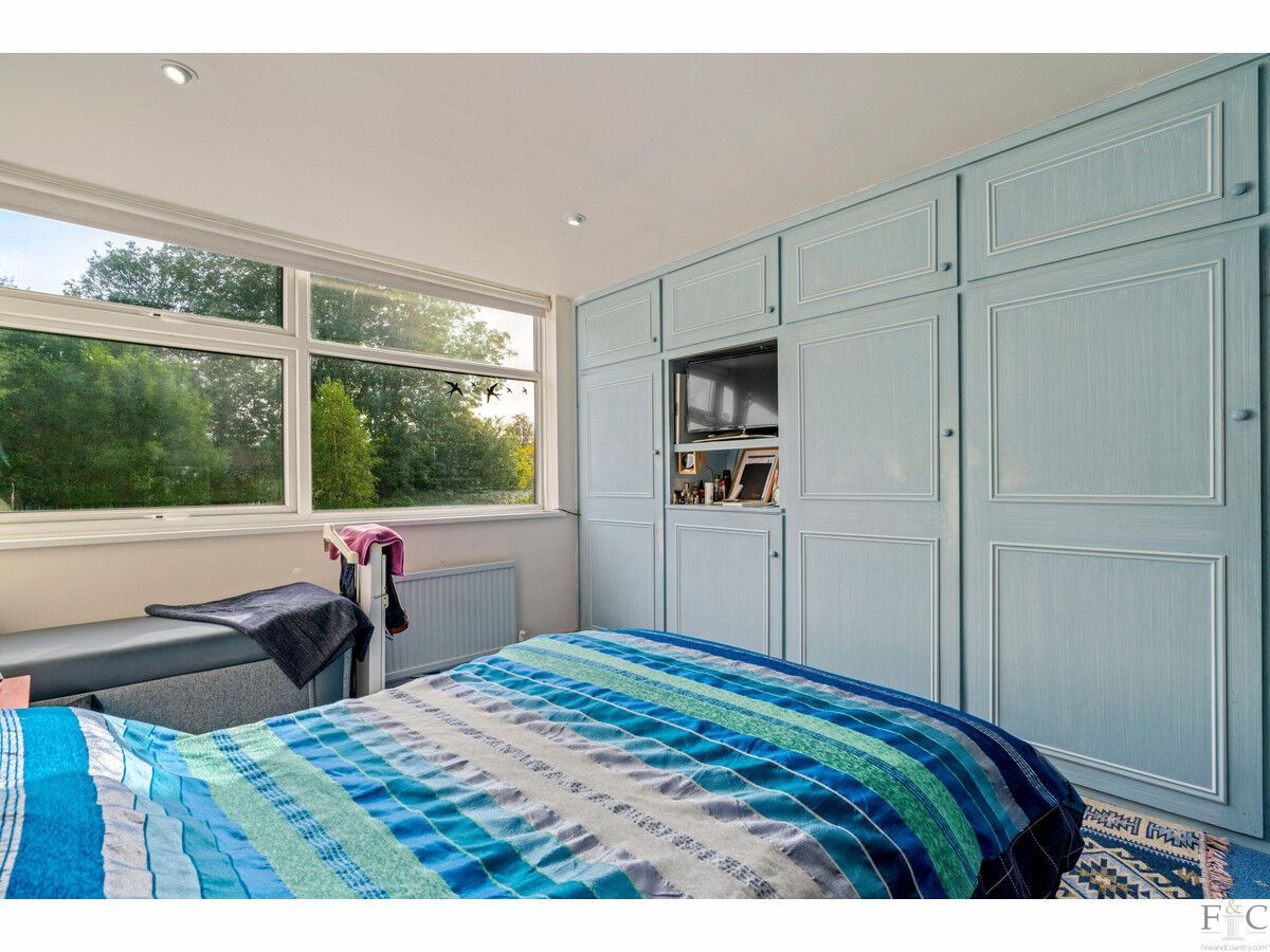 The master bedroom is a great size and the views over the garden and beyond are just stunning. A large window makes the most of the natural light throughout the day. The décor is neutral and light and fitted wardrobes will house the most well-dressed. An en suite bathroom adds that extra level of style.