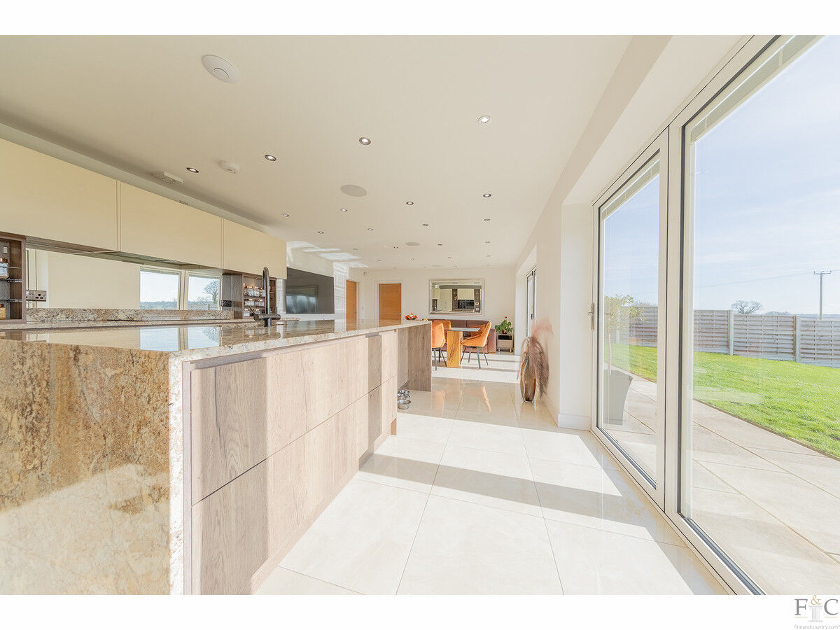 The kitchen is so often referred to as the heartbeat of a home and this one is sure to be a room bustling with activity, being both beautifully practical and tastefully stylish. While there is a natural position for more informal dining to appreciate the views of the garden and beyond, the overall centrality of food preparation would allow the flow of family or guests to be able to move unhindered, while conversation, catering and eating happen. This is a hospitality hub and it is maximised with the addition of a pair of symmetrically positioned bi-folding doors. Larger scale entertaining has never been easier to accommodate! In fact, the focus on hospitality or relaxation, which ever best suits your mood or day, is maximised here. This open room is a delightful workspace. The present owners focused on the patterns and colours within the marble selected for the central island with sink, and in so doing, have included a swathe of spacious, wall and floor fitted storage units in soft close, no handles styles. Integrated appliances included in the sale are the oven, fridge freezer, wine cooler, microwave and dishwasher. A tiled floor, contemporary light fixtures and fittings all coordinate this area.