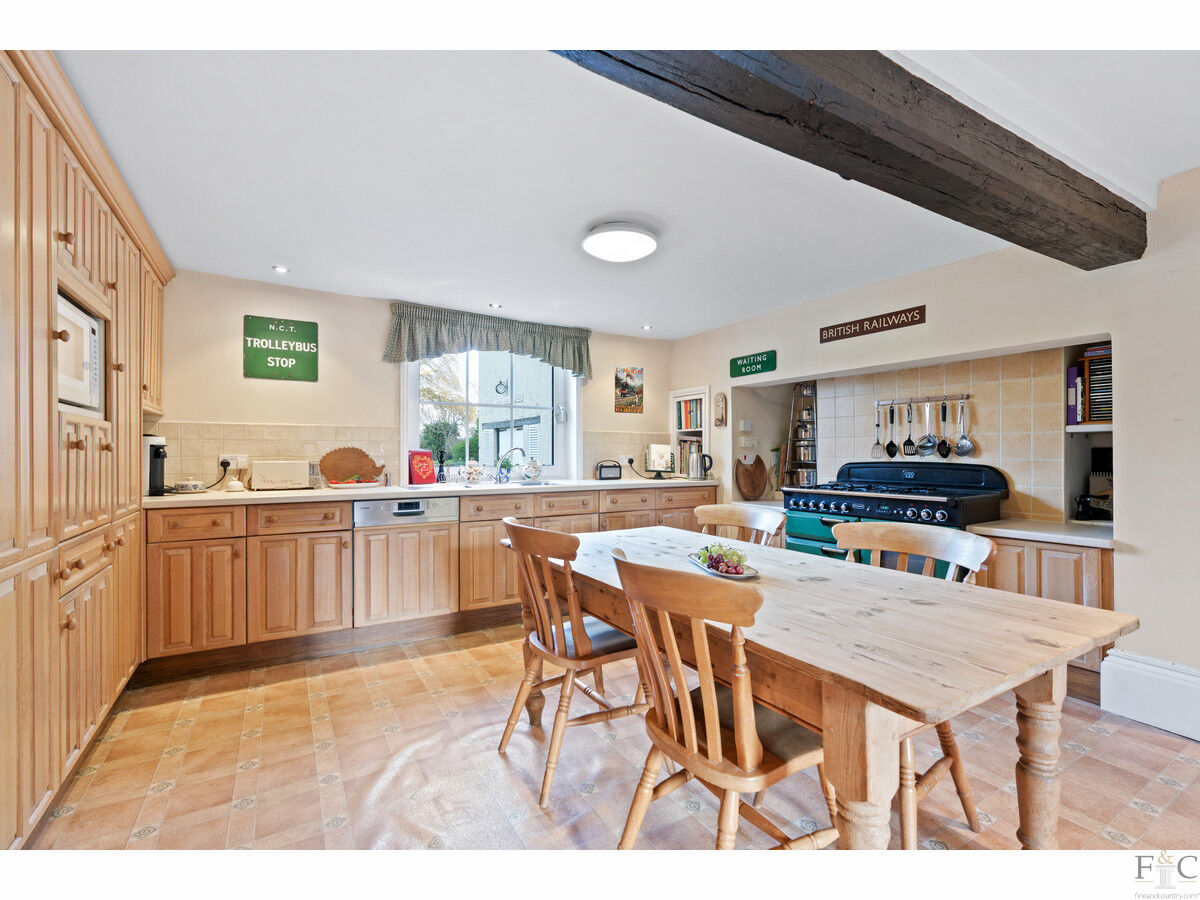 The house is nicely presented throughout, starting with the fabulous 17x15ft dining room which is the perfect place for entertaining and has heritage picture rails, a large low window with beautiful views of the village church of St Nicholas – floodlit at night - across the road and a fine fireplace flanked by glazed display cupboards.