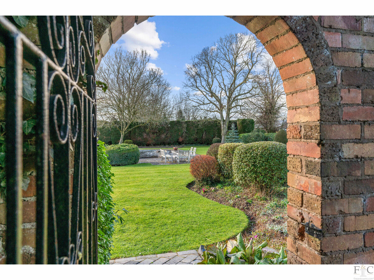 With its pale stucco exterior and duo of ornate gables, The Old Rectory is alluringly well-kept and attractive. Wrought iron gates in a red-brick wall open onto a gravel driveway and there’s a gracious turning circle in front of the house, a triple garage, arched white double doors to the rear of the property and parking space for multiple cars.