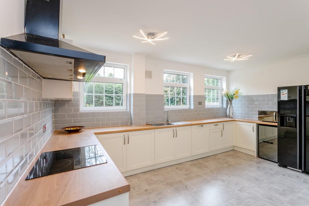 A side lobby provides access to the garage. The ground floor wet room has a three piece suite comprising enclosed WC, wash hand basin, shower with fixed, flexible and jet showerheads. Ground floor bedroom has double glazed window to rear elevation. The Newly fitted kitchen boasts a range of modern fronted eye and base level units, stainless steel one and a quarter bowl sink with mixer tap above, wine cooler, and electric hob. A boiler room houses the Worcester floor mounted boiler and offers plumbing for an automatic washing machine. A second fitted kitchen completes the ground floor accommodation, having a range of cream eye and base level units, polycarbonate sink with mixer tap over, Rangemaster oven and a double oven and grill, six ring gas hob with extractor unit above.