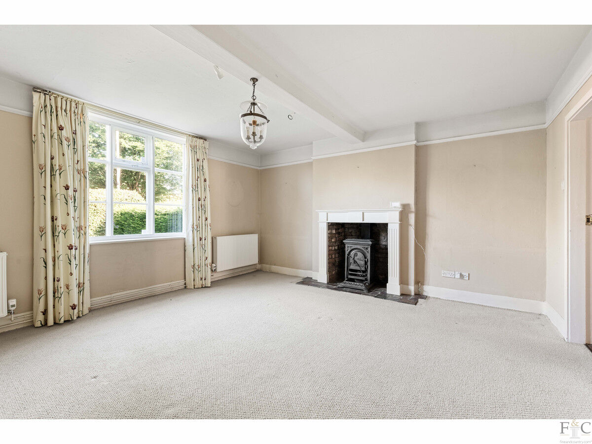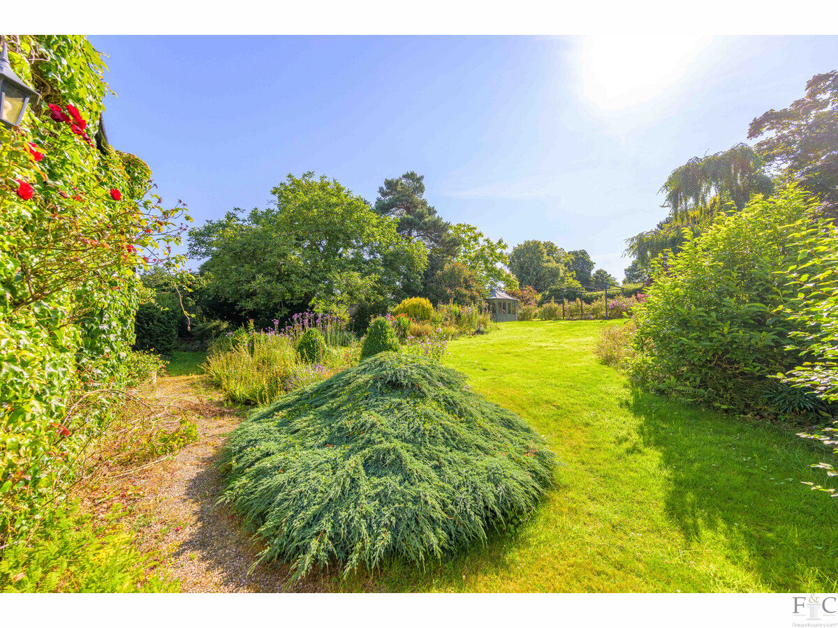 Presently, there are three large reception rooms – sitting room, lounge and music room - an imposing hall with capacity for dining, a kitchen/dining room with separate pantry and utility room, a downstairs cloakroom, seven bedrooms and two family bathrooms. Two of the bedrooms have en-suites. Outside, the grounds are equally generous and amount to just under one acre of land. They extend beyond a landscaped arrangement of traditional lawns and planted beds containing cottage plants, shrubbery and trees, to a rear field beyond the garden border, suitable for livestock. A hedge runs alongside the property, creating a perimeter drive leading to a double garage which was once the stable block. There is ample space at the top of the drive for turning or parking several vehicles.