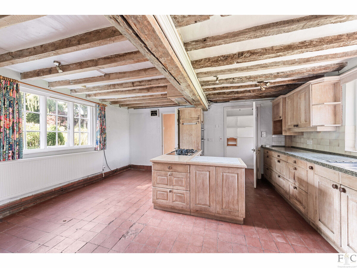 A step divides the area into an inner hallway. Immediately ahead is a cloakroom, fitted with basin and toilet and has a window overlooking the rear gardens. The quarry tiles and exposed beams continue throughout the kitchen and utility and in keeping with the countryside, rustic character of the rooms, the integrated floor and wall units are wooden Shaker style with worktops and tiles in neutral shades. There is ample space for informal dining and a large, shelved pantry provides substantial storage.