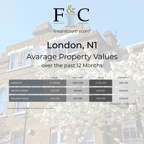 According to the latest data collected over the past 12 months, the average sales prices in N1 are significantly higher than both the Greater London and national averages. Here’s a breakdown by property type: