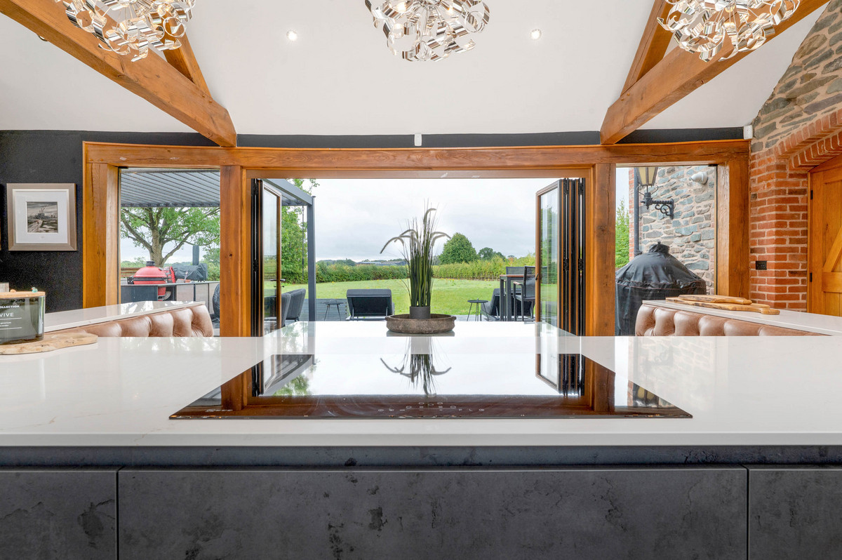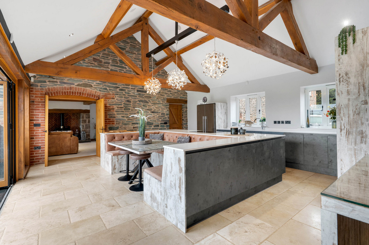 A wide oak door opens into a generous entrance hall, where a stone floor, heavily beamed ceiling, and a bespoke oak staircase with an intricately designed metal balustrade set the tone for the home’s character and craftsmanship. Rising to an open first-floor gallery, the hallway is double height in part, with exposed stonework adding further charm. From here, there is access to an under-stair’s storage cupboard and a beautifully appointed cloakroom featuring a freestanding, floor-mounted basin. The kitchen is a true showpiece stylishly refitted in 2023. The kitchens design is centre around a dining area ideal for those with entertaining in mind and an impressive range of appliance include two Neff oven, two warming drawers, Induction hob, Fisher & Paykel American style fridge/freeze, wine fridge, two dish washers and Grohe boiling water tap...