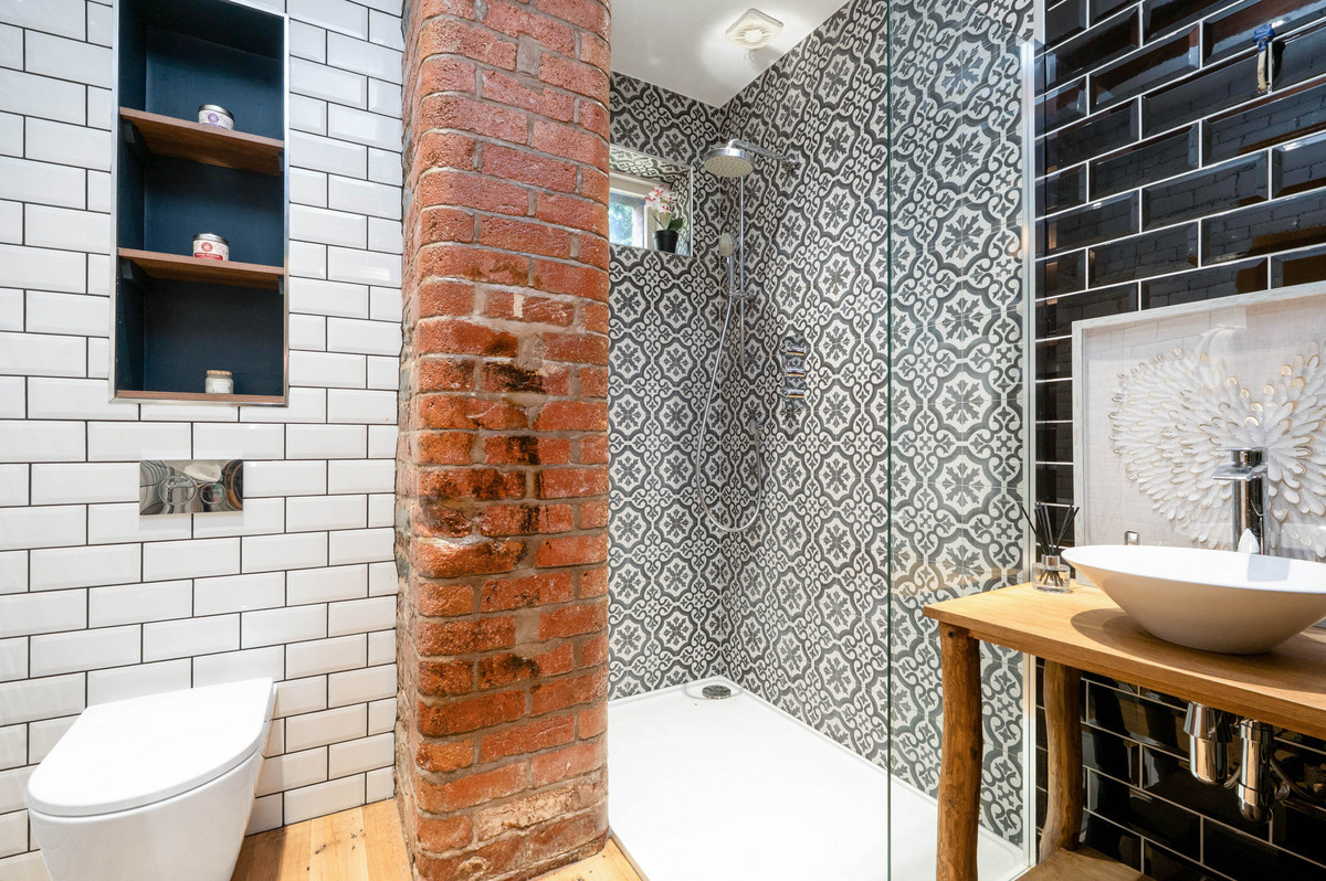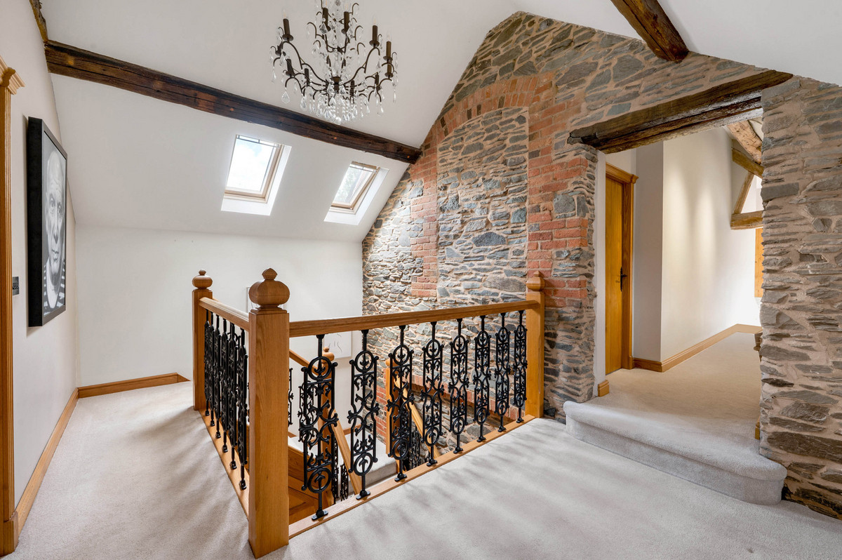 The first-floor landing extends almost the full length of the property, creating an impressive gallery space enhanced by exposed stonework, oak-framed glazing, and original roof timbers. Three spacious double bedrooms occupy this level, each with its own en suite bathroom or shower room. Vaulted ceilings, exposed beams, and abundant natural light give these rooms a sense of scale and character rarely found in such properties. The principal bedroom is particularly striking, with an almost fully glazed south elevation that opens through French doors onto a private balcony—perfect for enjoying countryside views. This suite also benefits from a fully fitted walk-in wardrobe and a luxurious en suite bathroom featuring a Villeroy & Boch double-ended bath, twin wash basins, and a generous double shower.