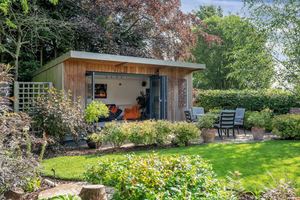 Standing detached within the rear garden this modern contemporary style structure offers additional living space to that of the main house. Currently used for relaxation and for when entertaining alfresco this cool space has previously been used as a home office. Fully insulated and wood-clad the garden room has mains electricity, electric heating, spotlights, integrated audio system, wi-fi, bi-folding doors and outdoor spotlights.