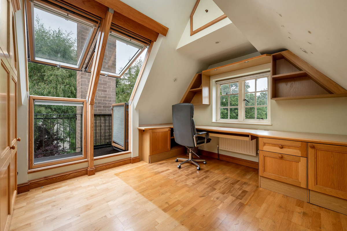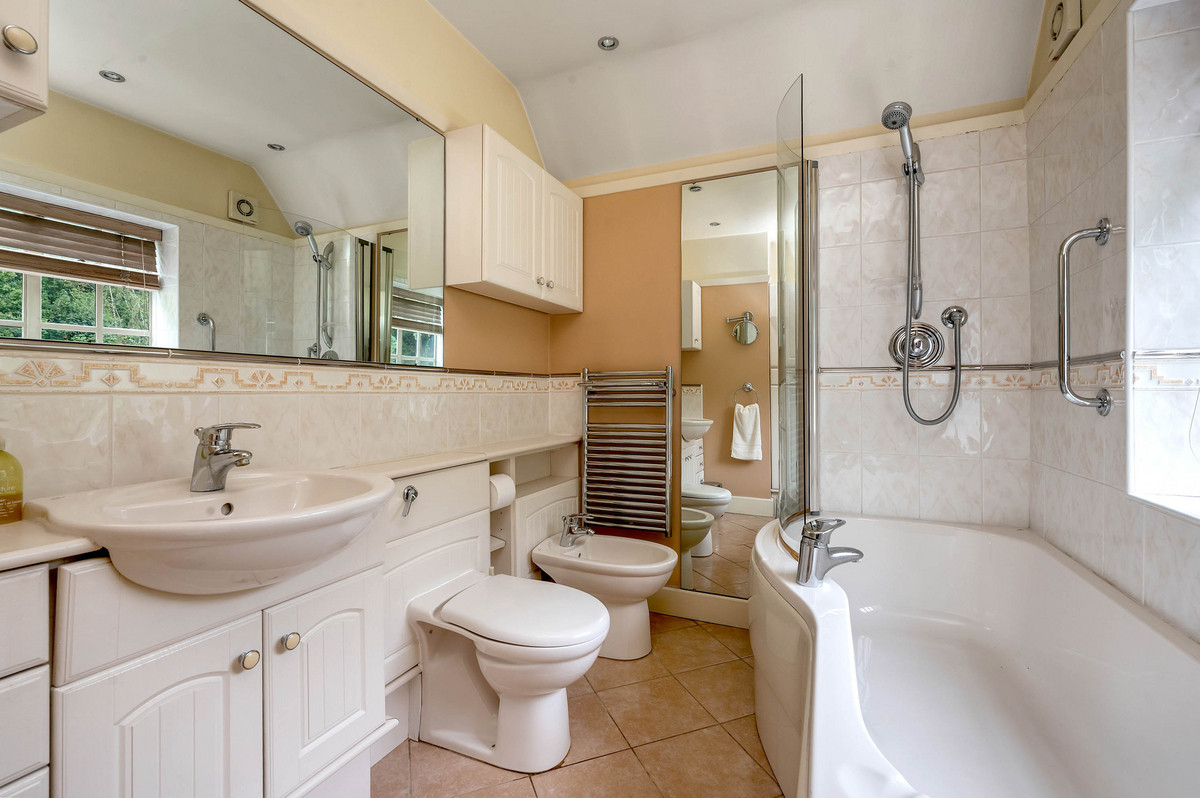 The landing provides access to two large bedrooms and separate cloaks/WC. Bedroom one occupies the southwest corner of the house and in addition to a large, bay window features a walk-on balcony enjoying lovely views over the rear garden and adjoining woodland. Bedroom one also has its own ensuite bathroom, fitted with a three-piece suite.