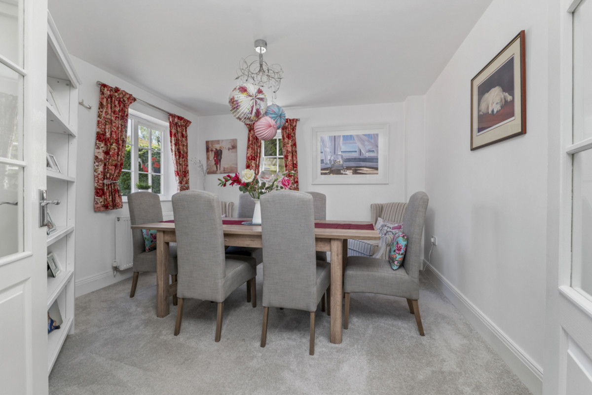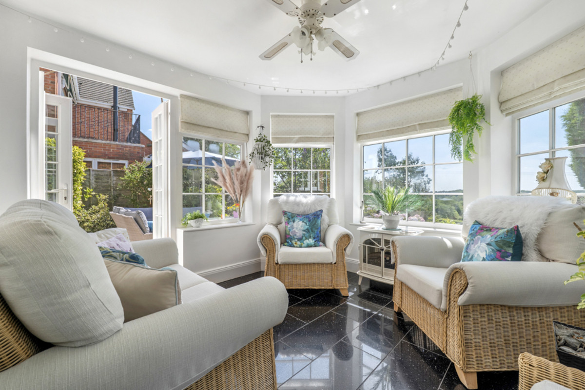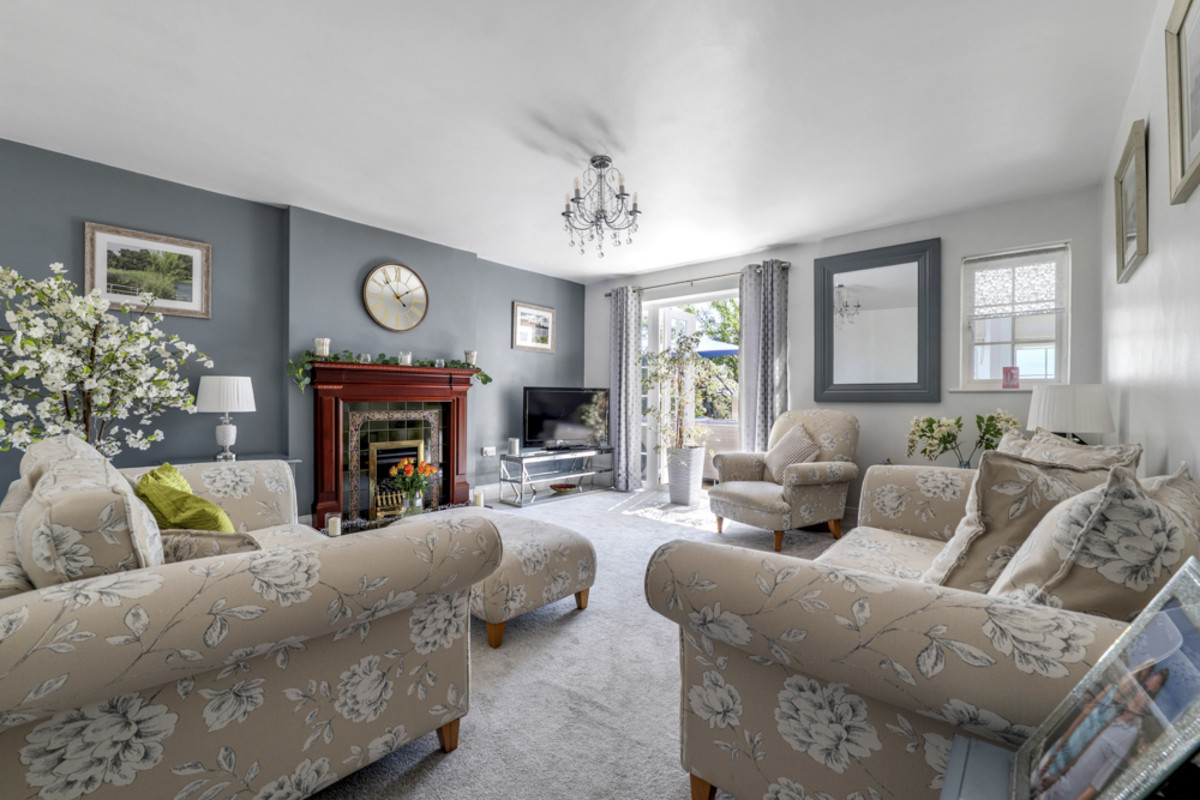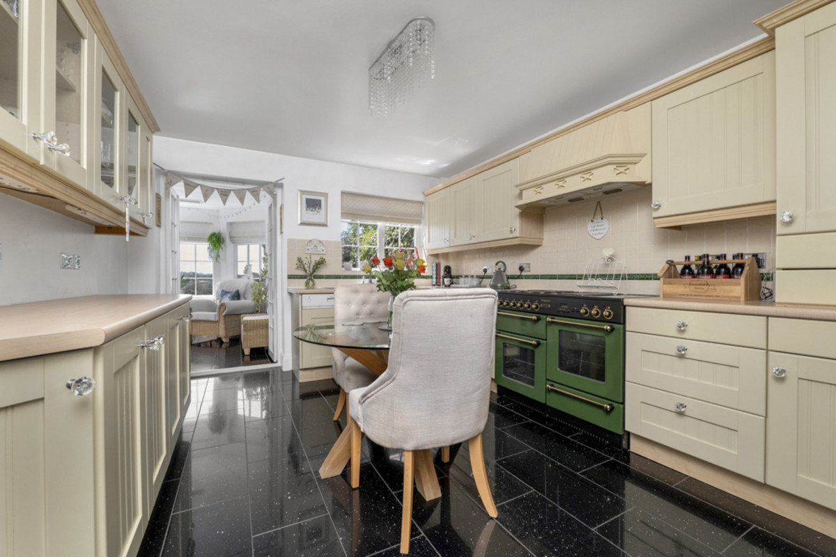 Toward the rear of the hallway, you'll find a well-appointed breakfast kitchen featuring a comprehensive range of wall and base units, ample worktop space, and integrated appliances throughout. Double doors from the kitchen open into a charming garden room, providing an ideal spot to relax and enjoy views over the beautifully landscaped rear garden and the open countryside beyond.
