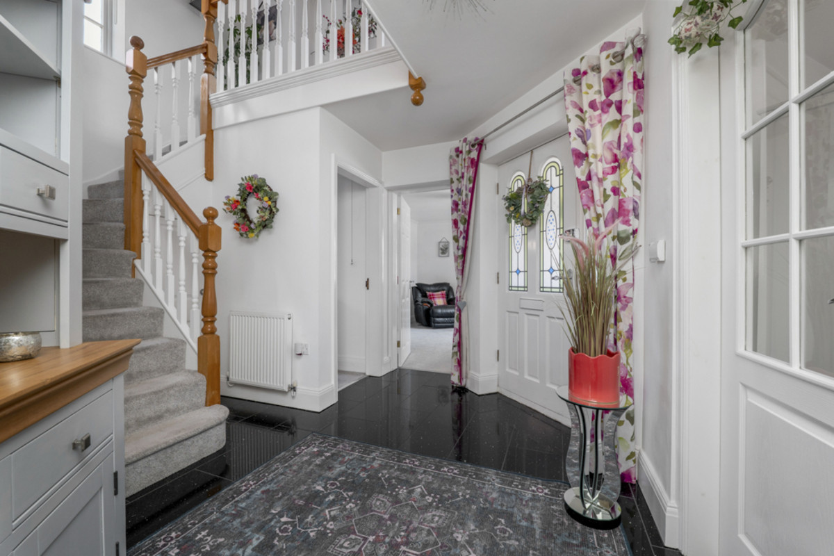 Immaculately presented throughout, the accommodation is arranged around a striking central hallway featuring an open staircase and a stunning galleried landing, creating an immediate sense of light and space. The ground floor offers three well-proportioned reception rooms, while the stylishly fitted kitchen flows seamlessly into a light-filled garden room.