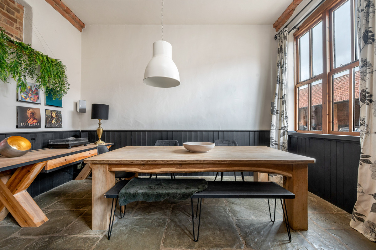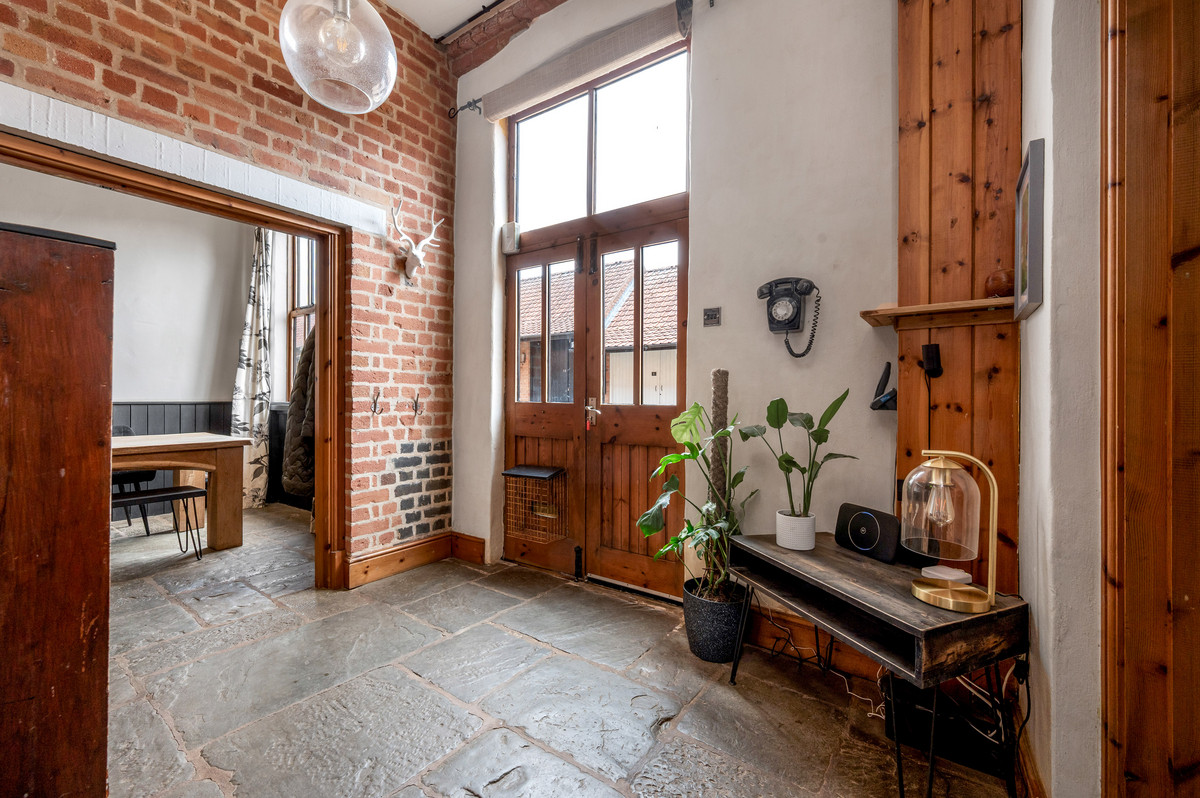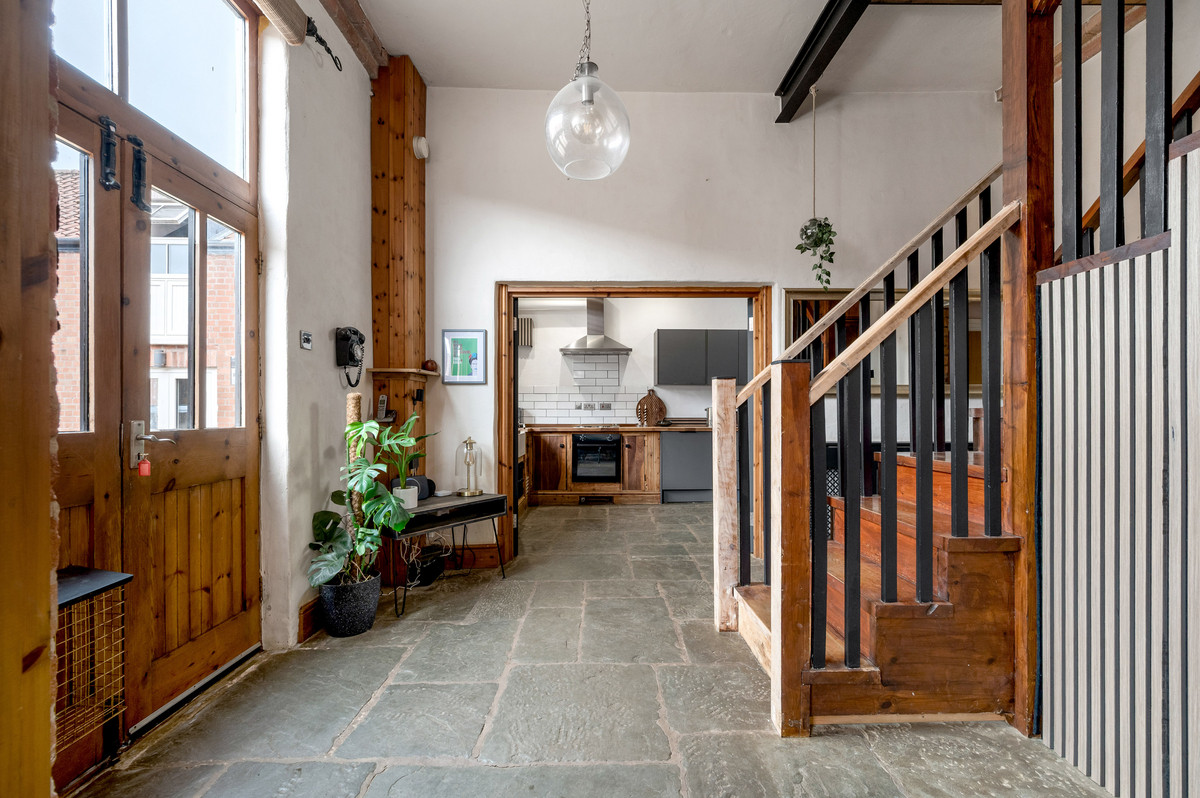The property is entered into a spacious, open plan dining hall with stone floor, exposed brickwork and a central staircase is a particular feature. From the dining hall, fully glazed doors open into a contemporary style kitchen with matching stone floor and included are a range of appliances. The kitchen flows seamlessly into a family room with floor to ceiling fitting shelving and doors to garden. A separate sitting room of generous proportions features a free-standing log burner, and double doors provide direct access to the rear garden. A stylishly fitted cloaks/WC completes the ground floor accommodation.