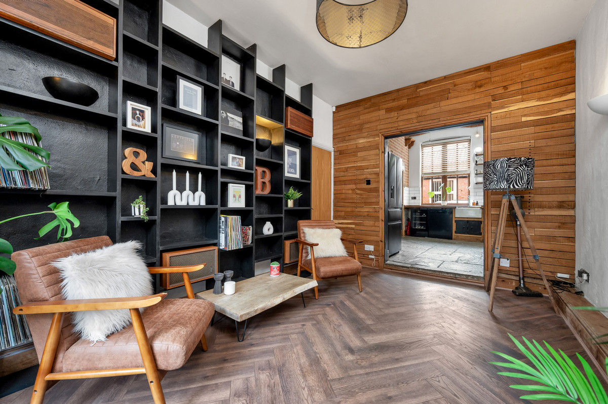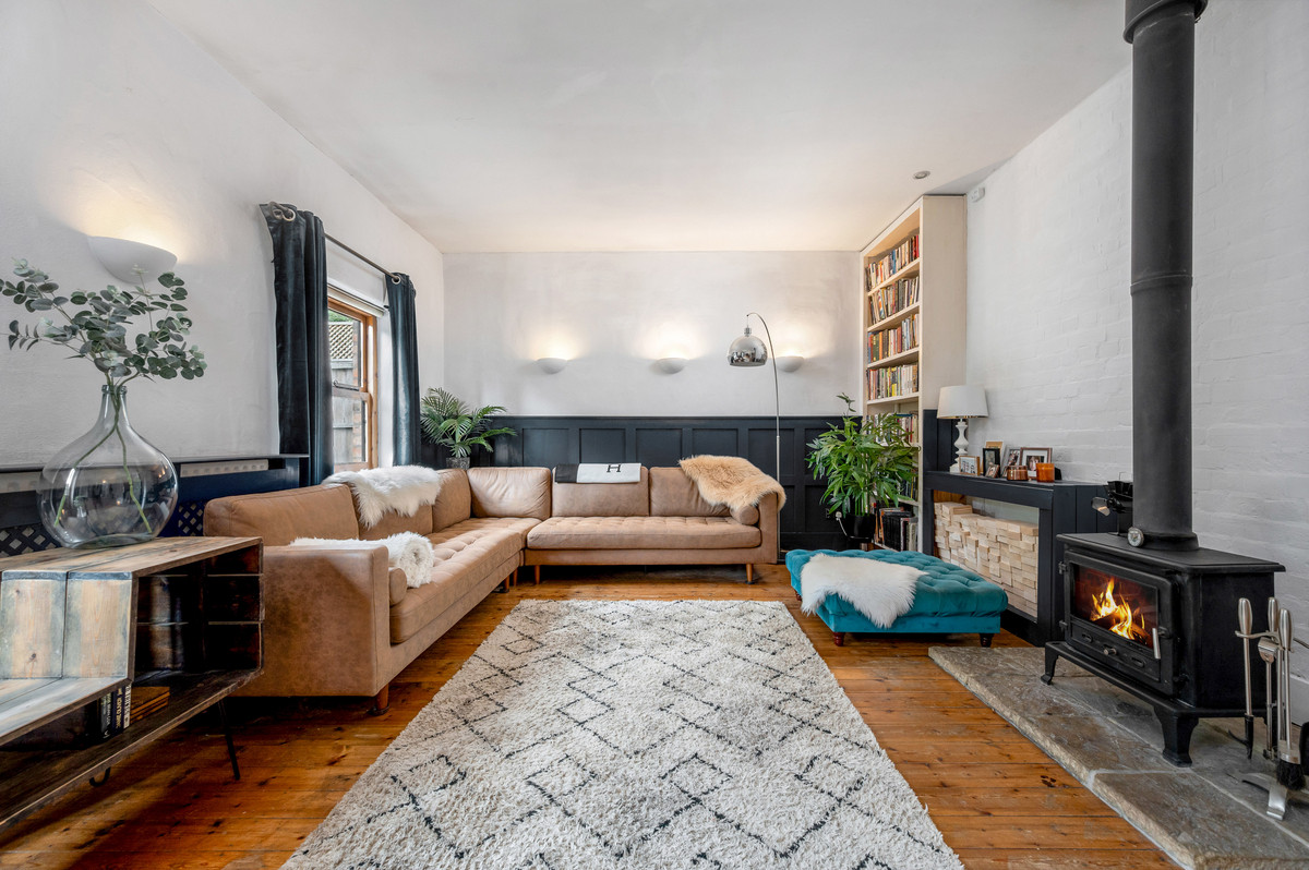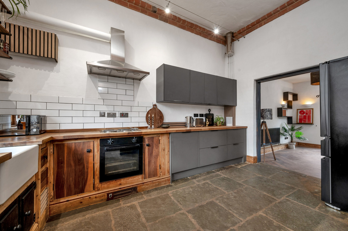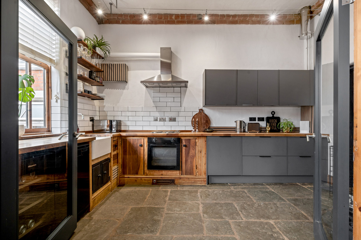 The property is entered into a spacious, open plan dining hall with stone floor, exposed brickwork and a central staircase is a particular feature. From the dining hall, fully glazed doors open into a contemporary style kitchen with matching stone floor and included are a range of appliances. The kitchen flows seamlessly into a family room with floor to ceiling fitting shelving and doors to garden. A separate sitting room of generous proportions features a free-standing log burner, and double doors provide direct access to the rear garden. A stylishly fitted cloaks/WC completes the ground floor accommodation.