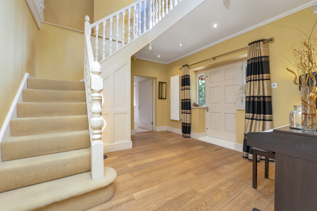 With accommodation extending to just over 4,000 sq ft, the layout lends itself to both family life and entertaining. The ground floor boasts five generous reception rooms, a large family kitchen, utility room, and a separate laundry/boot room. There is excellent potential to reconfigure the living space to suit modern, open plan living. Upstairs, an elegant galleried landing leads to six bedrooms, including two with ensuite facilities, and three well-appointed bath/shower rooms. Outside, the grounds surround the home and provide space for leisure, gardening, or equestrian use. The oversized detached double garage includes an upper room, ideal for use as a studio, home office or additional accommodation (subject to any necessary consents). Offered with no onward chain and priced to encourage a prompt sale, Barrowfield House presents a rare opportunity to acquire a spacious and flexible home in a highly desirable location.
