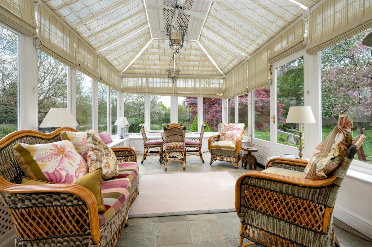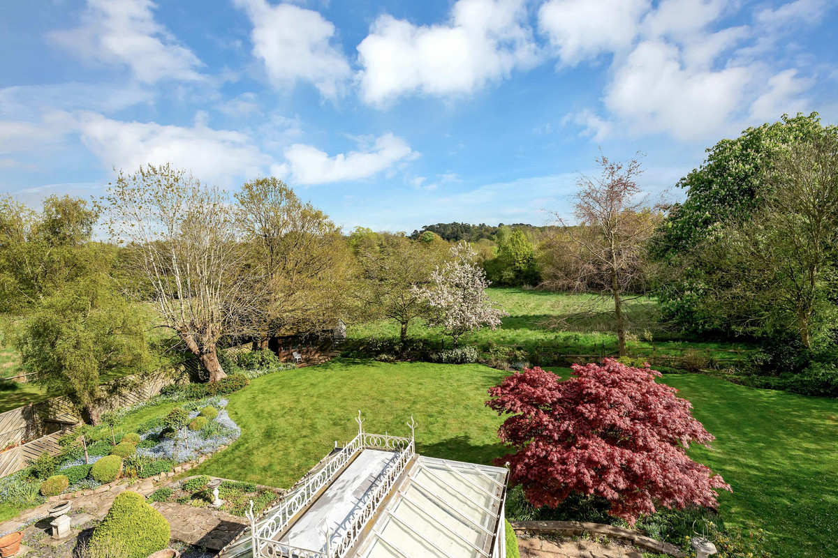 The property is entered through an entrance hall into a central dining room featuring lovely views over the rear garden, a sweeping staircase, and a distinctive corner open fireplace. To one side, a beautifully bright, southwest-facing sitting room includes a large inglenook-style fireplace and leads into a heavily glazed garden room—perfect for enjoying the views in all seasons. Adjacent is a spacious, triple-aspect drawing room, complete with a fireplace and French doors opening onto the garden, creating a superb space for entertaining or relaxing. An inner hallway leads to a cloakroom/WC and a fully bespoke kitchen with a dining area, a range of integrated appliances, and a walk-in pantry. A utility room with an external door and a separate boiler room completes the ground floor accommodation.