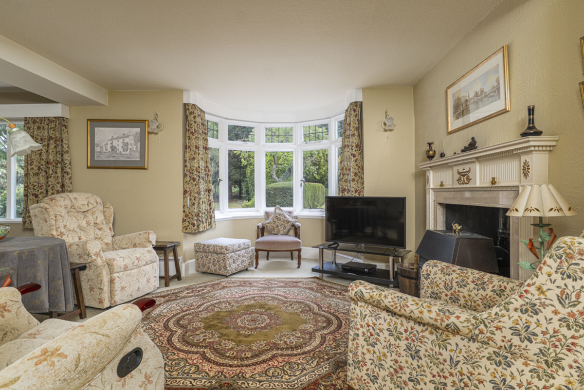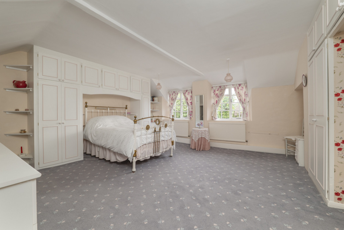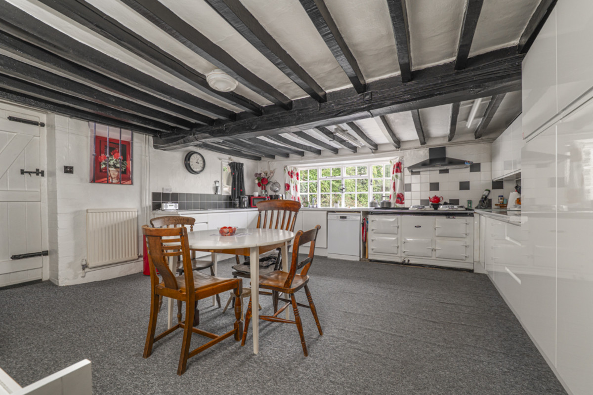 The snug includes a secondary staircase leading directly to bedrooms two and three, creating a distinctive and versatile layout. In keeping with the home’s character, the farmhouse-style kitchen is fitted with an AGA, while traditional rear windows frame sweeping views over the gardens. A large pantry, store and separate utility room complete the ground floor accommodation.