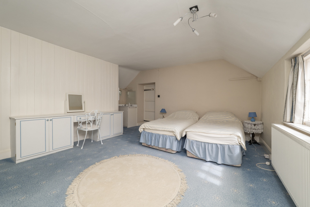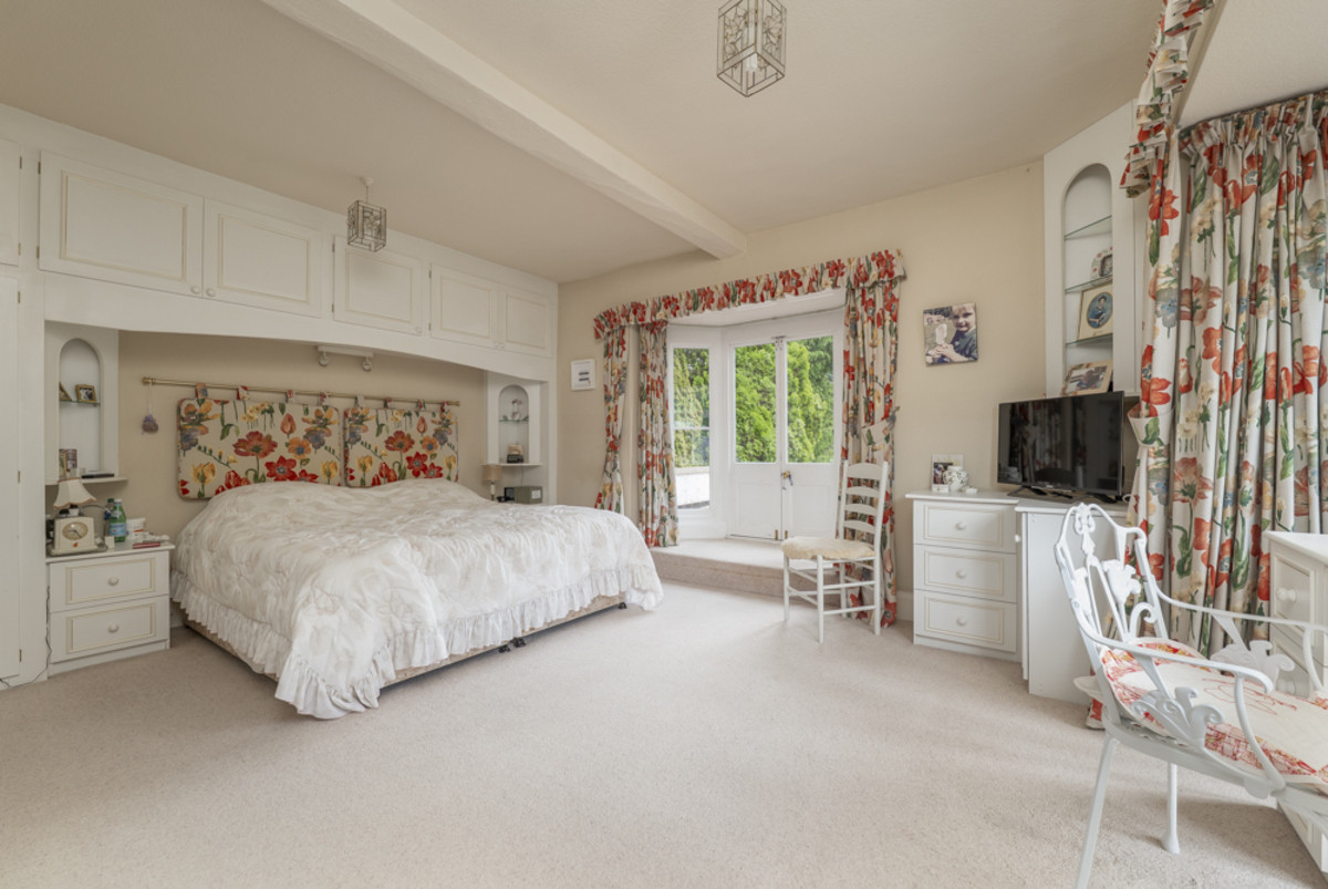 The landing leads to four generously sized bedrooms, two of which enjoy independent access via the secondary staircase from the snug. The first floor is served by two well-appointed family bathrooms, with one offering direct access from bedroom two. The principal bedroom boasts its own dressing room, while French doors open onto a private walled balcony, providing far-reaching views across the surrounding countryside.