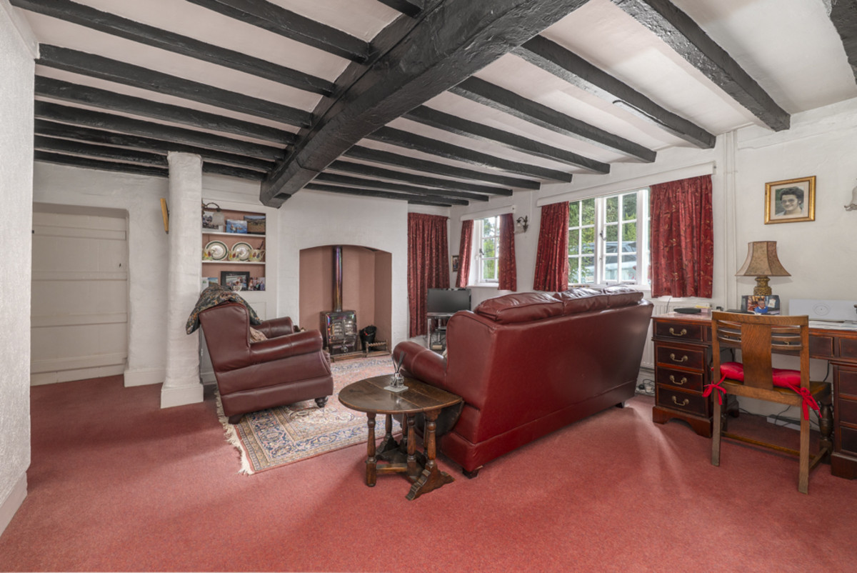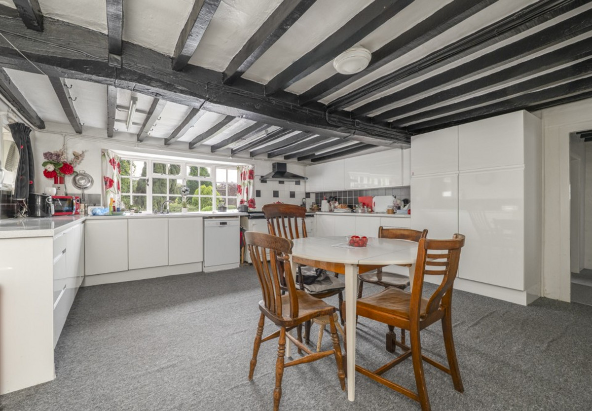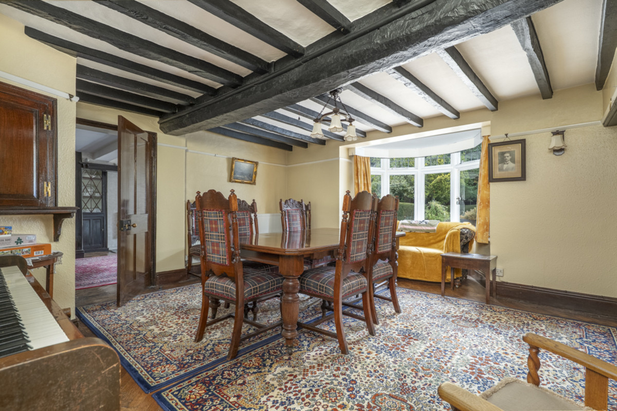 The property is approached via a central hallway, featuring an open staircase rising to the first floor. From the hall, access is given to the drawing room with its impressive bay window and wood-burning stove, a WC, and a formal dining room. Original beams add charm and character throughout the dining room, snug, and kitchen.