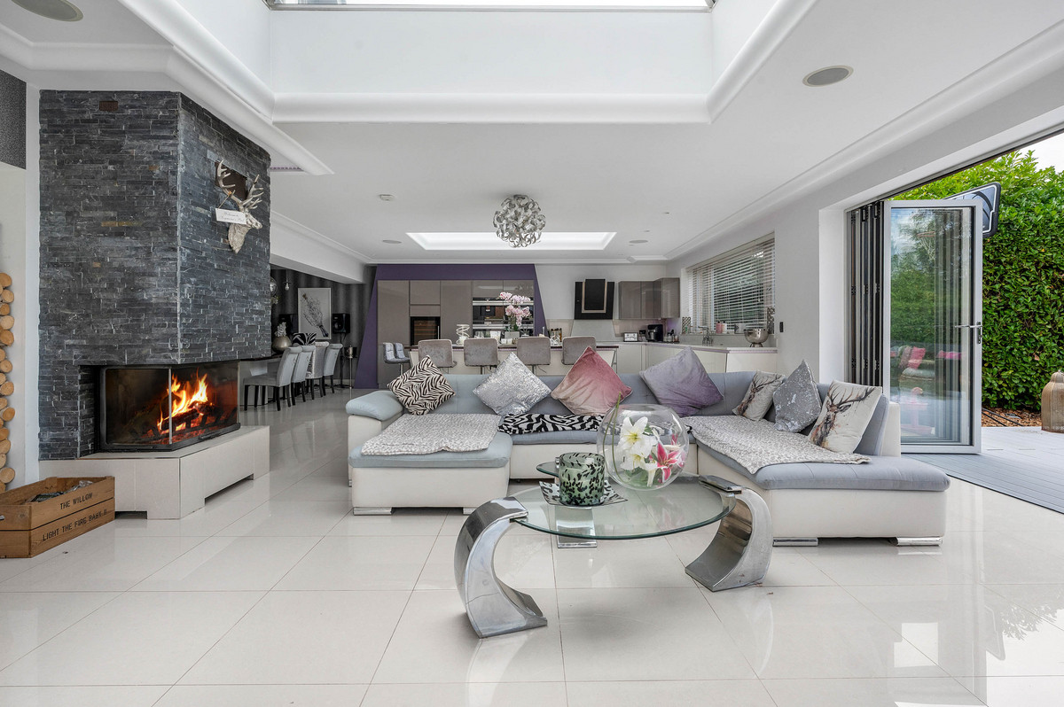 Two large roof lanterns flood the space with natural light, while twin sets of bifold doors create a seamless transition to the rear garden and wrap-around terrace. This superb space incorporates both a generous dining area and a cosy seating zone centred around a log-burning stove/Fire Box. A striking glass wall links the kitchen to a dedicated media room/home cinema, perfect for family entertainment. Completing the ground floor are a fully fitted utility room and a stylish cloakroom/WC.