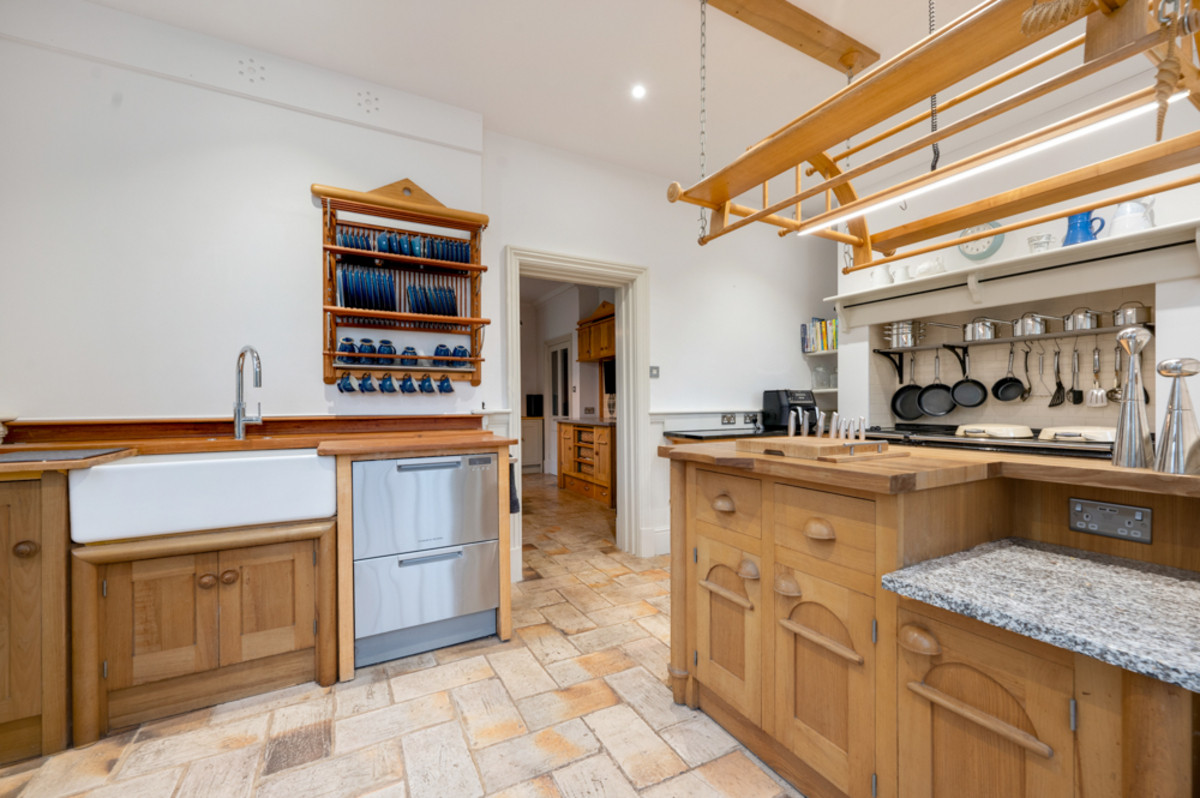 These two rooms could be combined to create a more open plan feel. The kitchen itself is fitted in a traditional style and include a range of appliances with an electric Aga. Doors from the kitchen open into a large glass house constructed by Vale Garden Houses. Fully glazed this double height space has a tiled floor and two sets of French doors provide direct access into the garden.