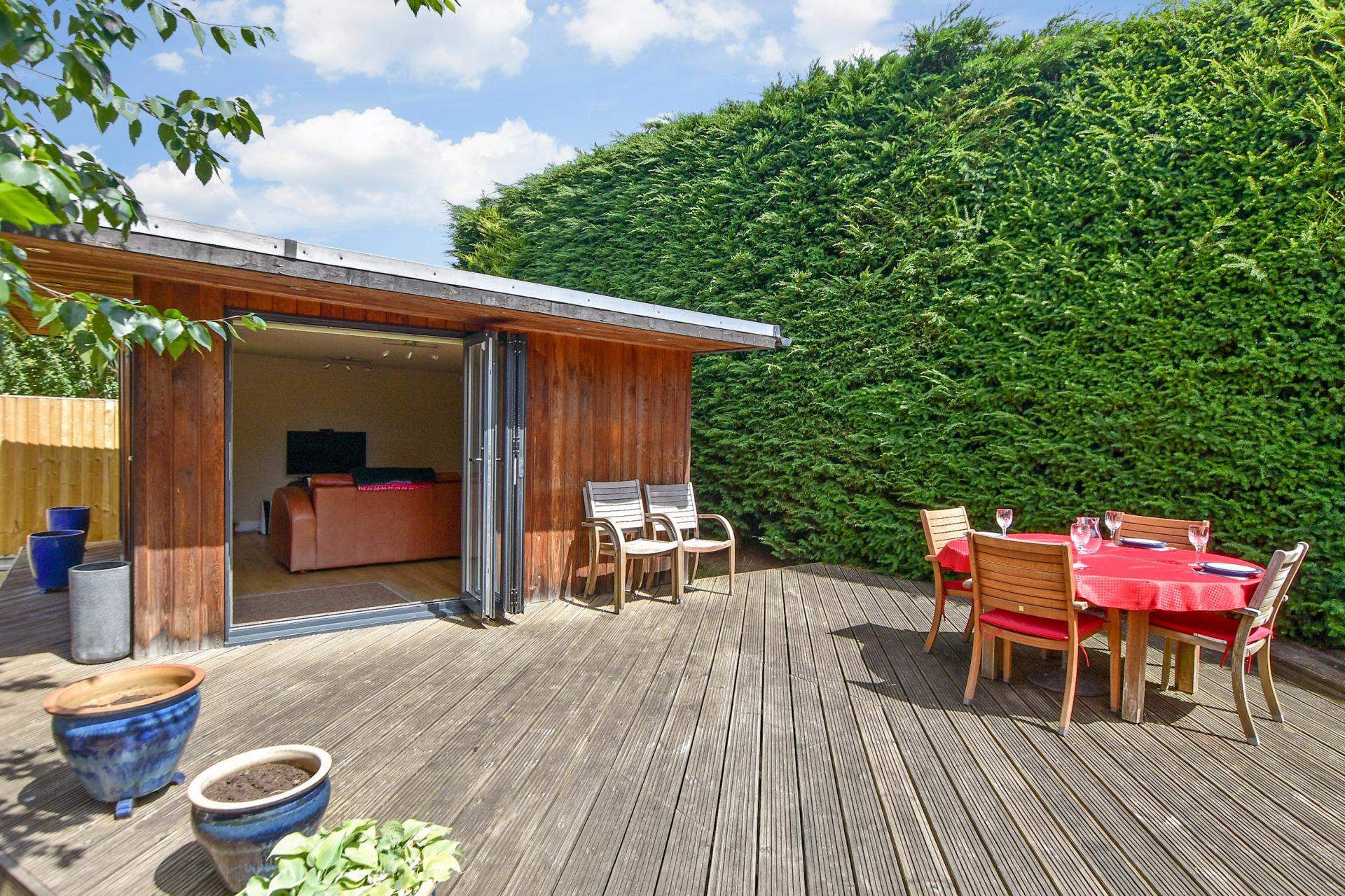 The large rear garden is a huge feature with its impressive patio and grass space that is ideal for al fresco dining or just lounging in the sunshine. There are steps down to a pathway flanked by level lawns and bordered by shrubs and trees that leads to a delightful dual aspect and insulated cedar clad outbuilding and a wrap around decked terrace, so you can follow the sun all day. With its bi-fold doors, lighting and electrics it would make an ideal summerhouse, games room or offices for anyone who wants to work from home.