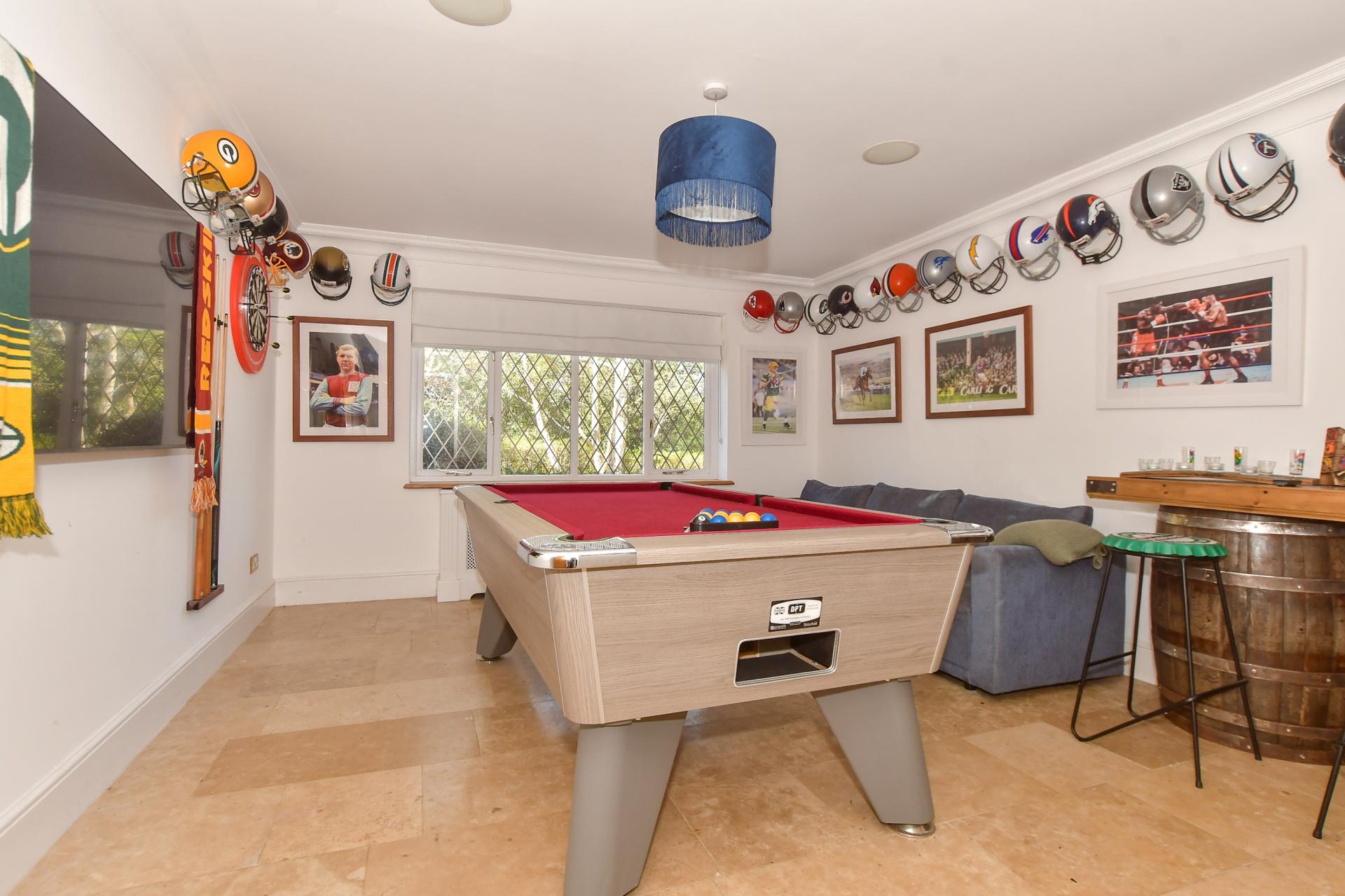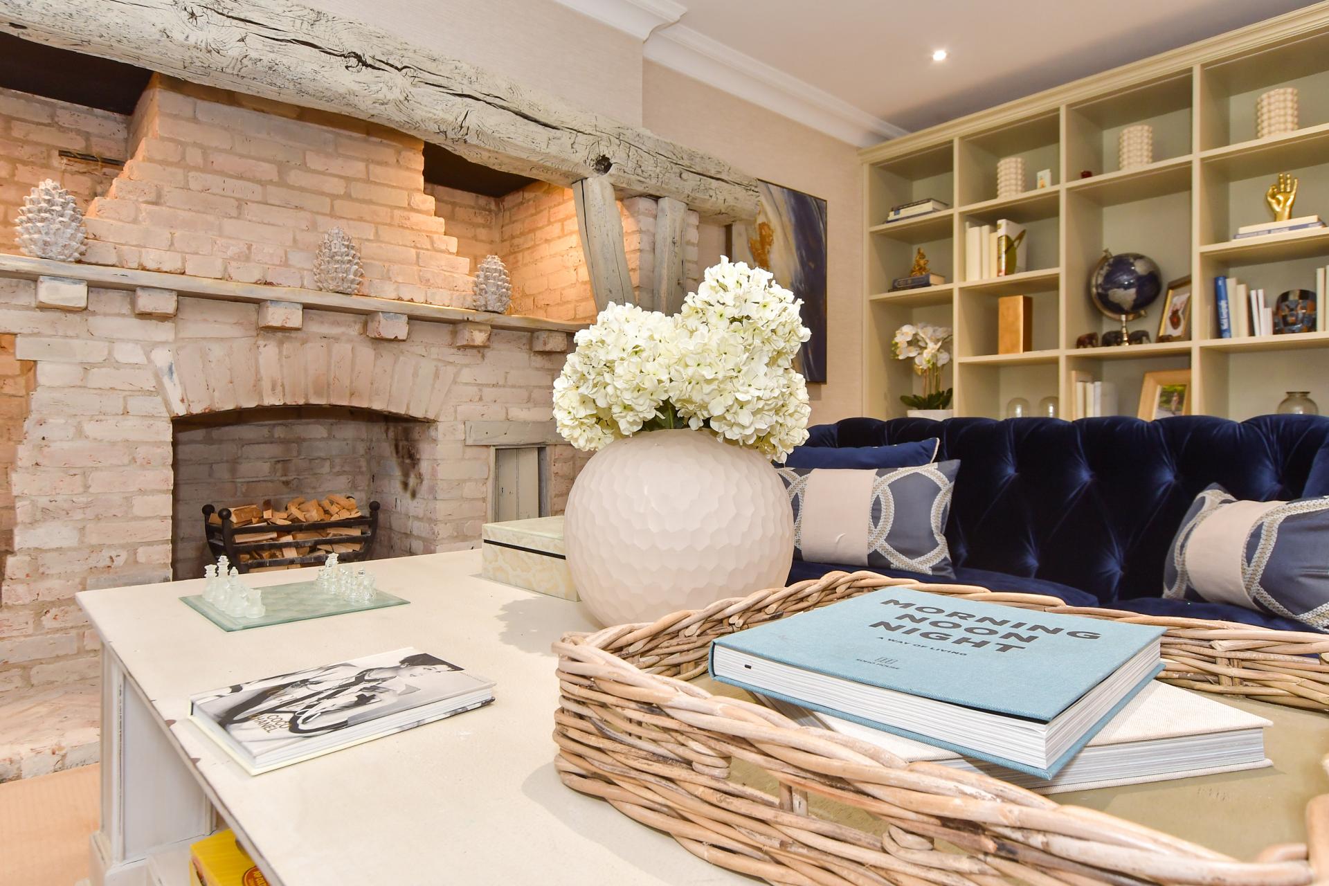 The double front door opens into a stunning entrance hall with access to a cloakroom and utility room, as well as the oak staircase, coved ceiling and oak doors that are found throughout. The ground floor includes a sitting room, family room and study as well as the kitchen with a breakfast area and a games room. There is a delightful sitting room that appears as a room of ‘two halves’. A TV area includes a bespoke built in unit surrounding a large inset TV screen while at the other end there are bookshelves and an impressive inglenook with an inner brick fireplace.