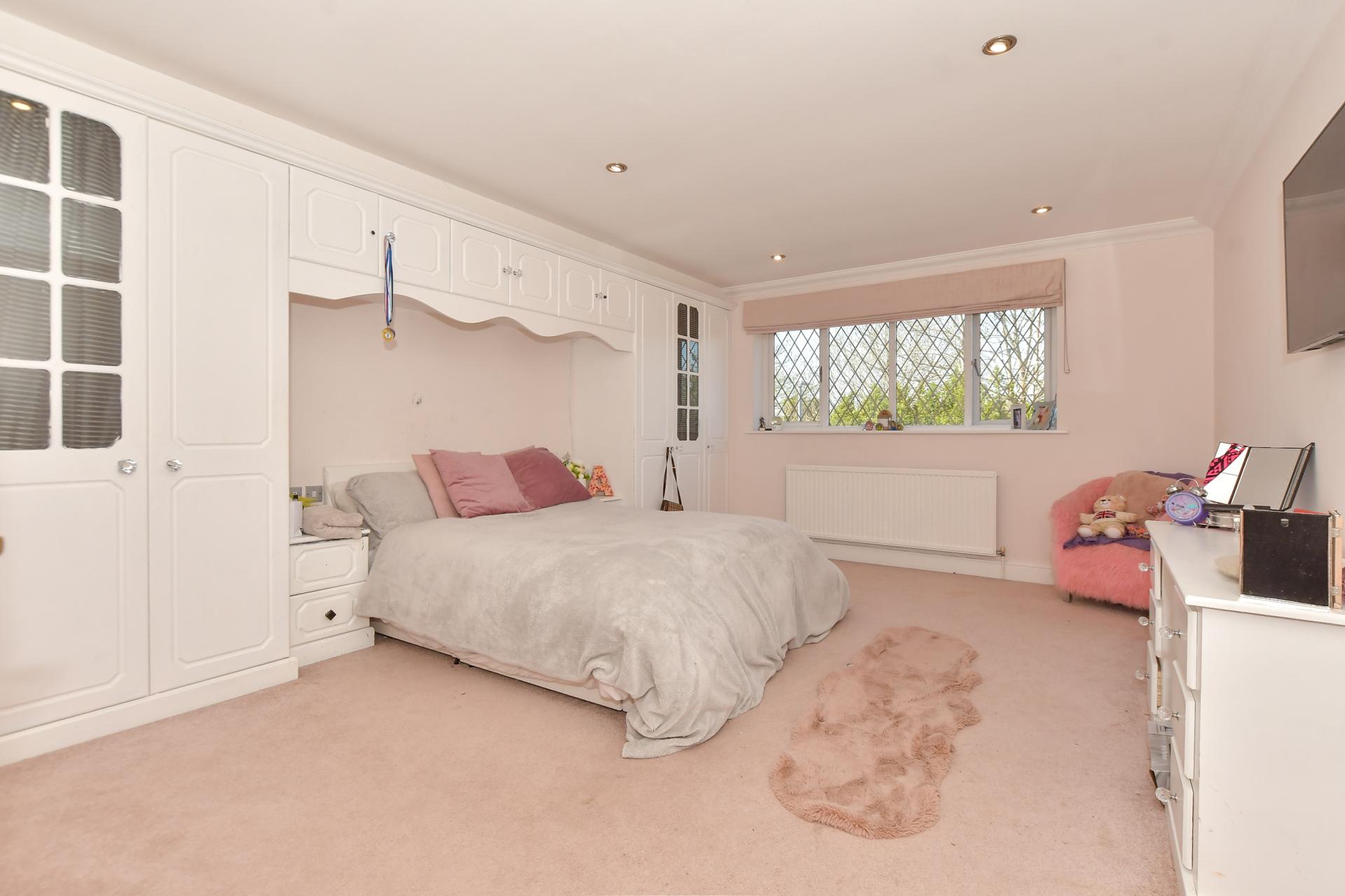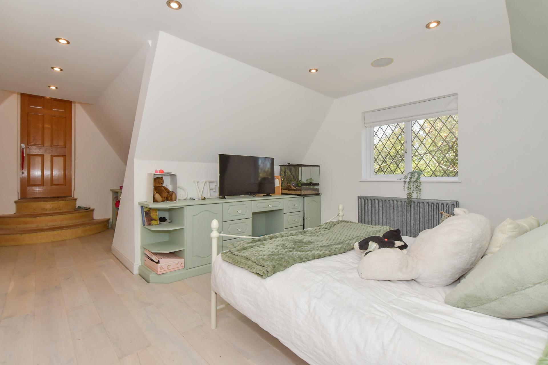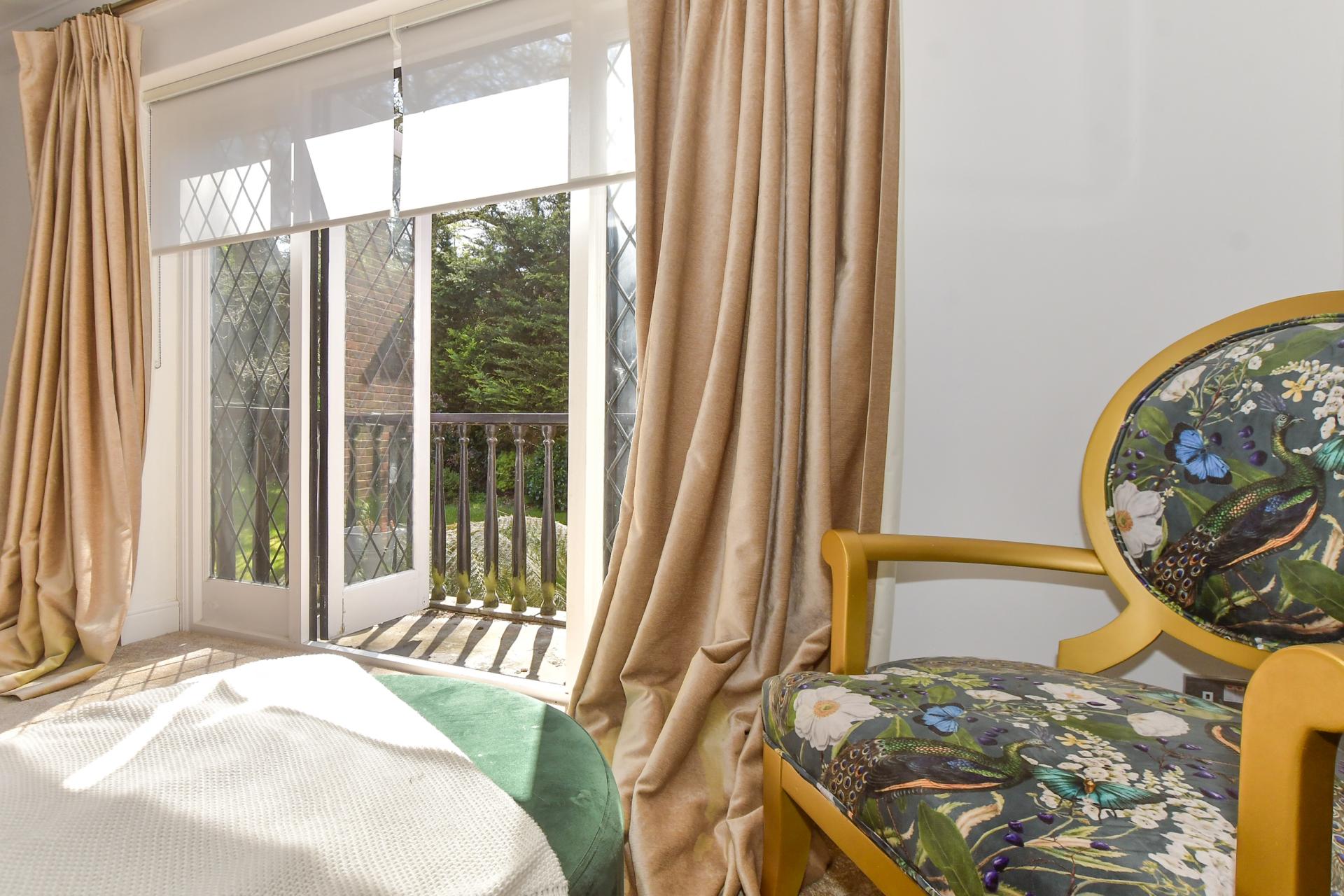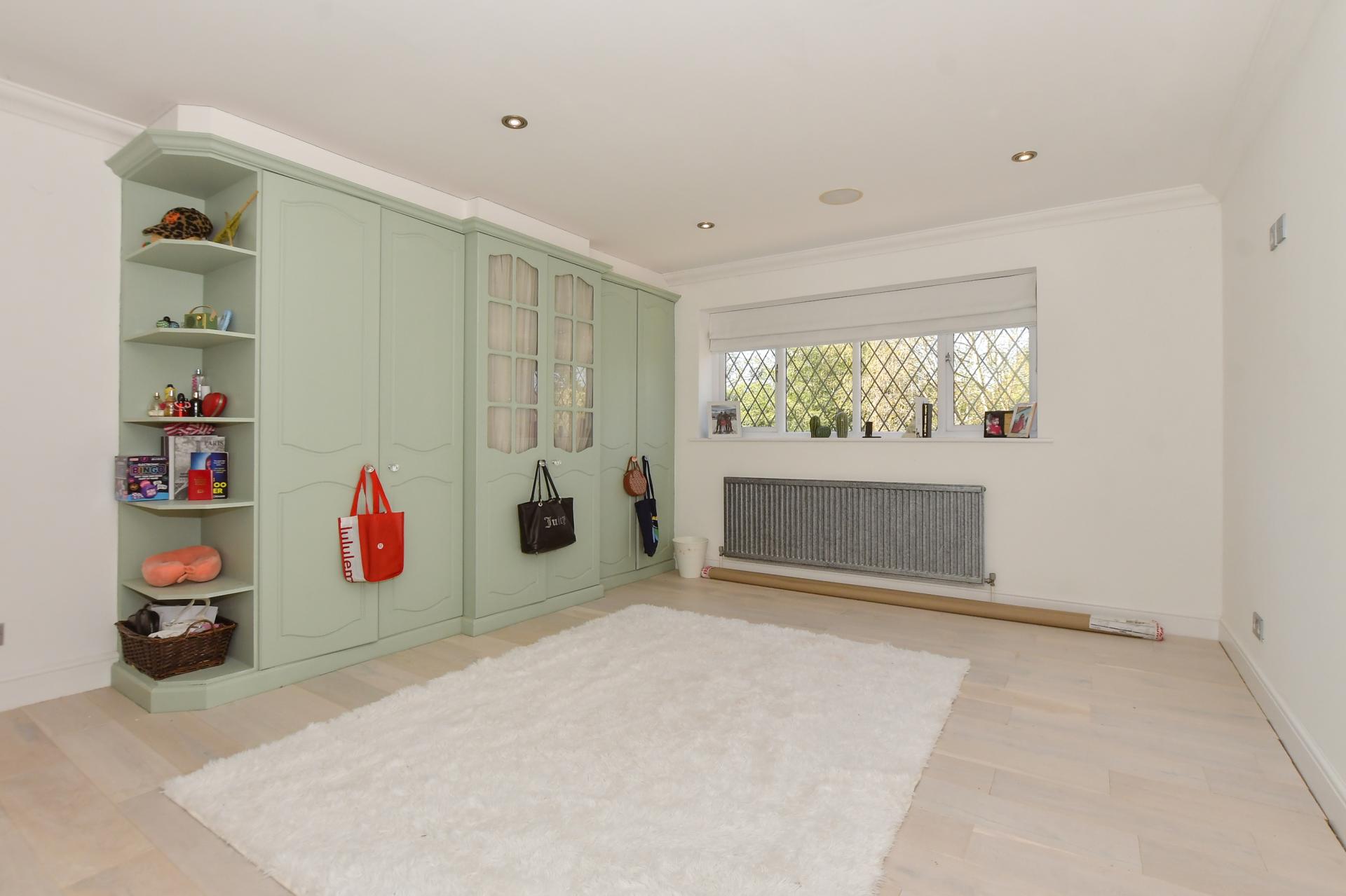 The galleried landing features two large storage cupboards and leads to the modern shower room and five bedrooms. These include one with fitted cupboards, a dressing area and an en-suite bathroom leading from a play room with fitted cupboards that could either be an additional bedroom or sitting room. While another bedroom is total luxury with numerous fitted cupboards, two dressing rooms, a superb en-suite bathroom with a bath and separate walk-in shower as well as access to a private balcony with views over the garden.