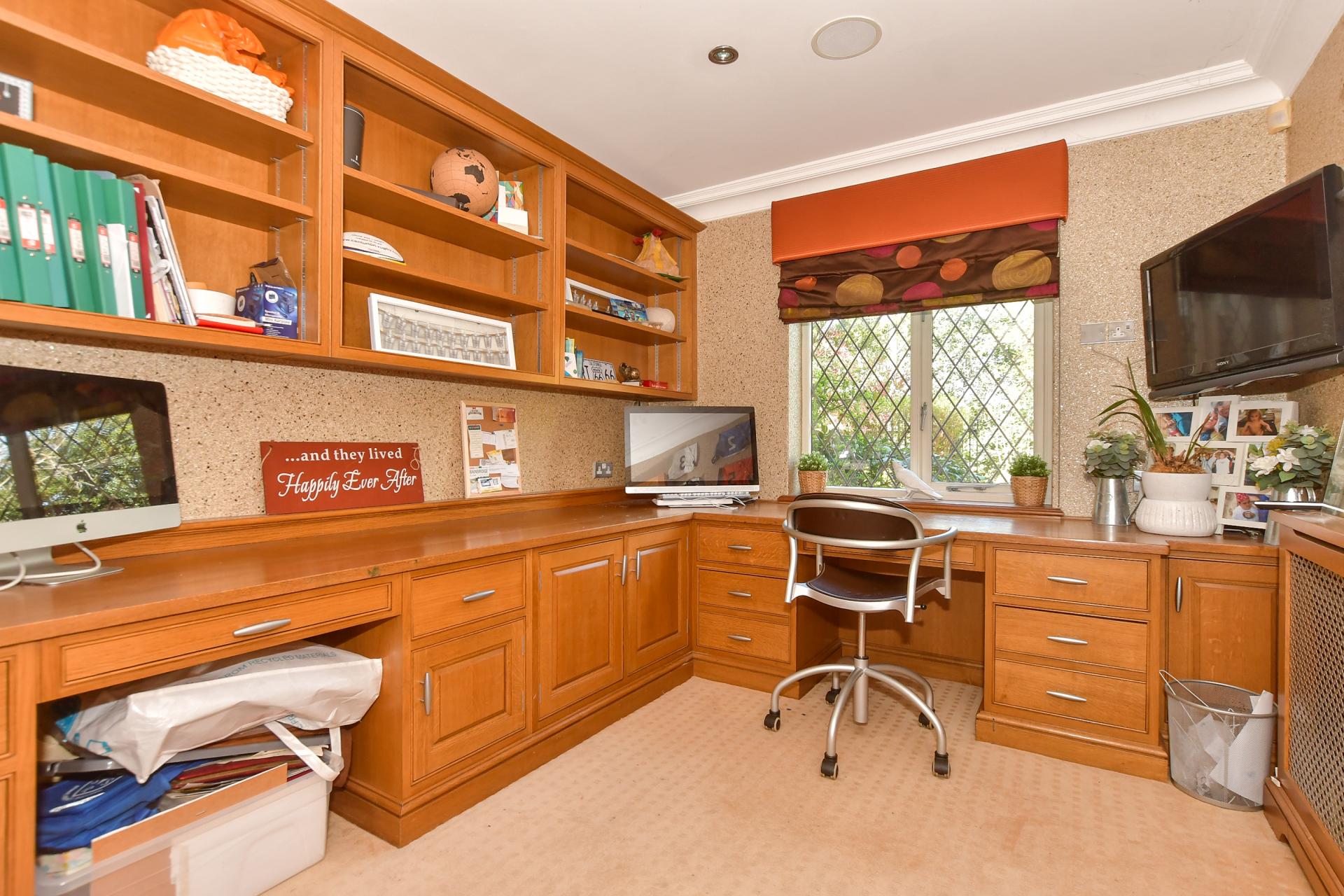 The beautifully fitted study is ideally located as it is easily accessible for business visitors, while the dual aspect family room with its box bay window and fitted unit could become a separate dining room for formal occasions. The contemporary kitchen and breakfast area is the heart of the home and includes tiled flooring, a trendy central island with an induction hob and extractor. There are a plethora of wood and white fronted units housing a variety of built in appliances, while still leaving plenty of space for a dining table.