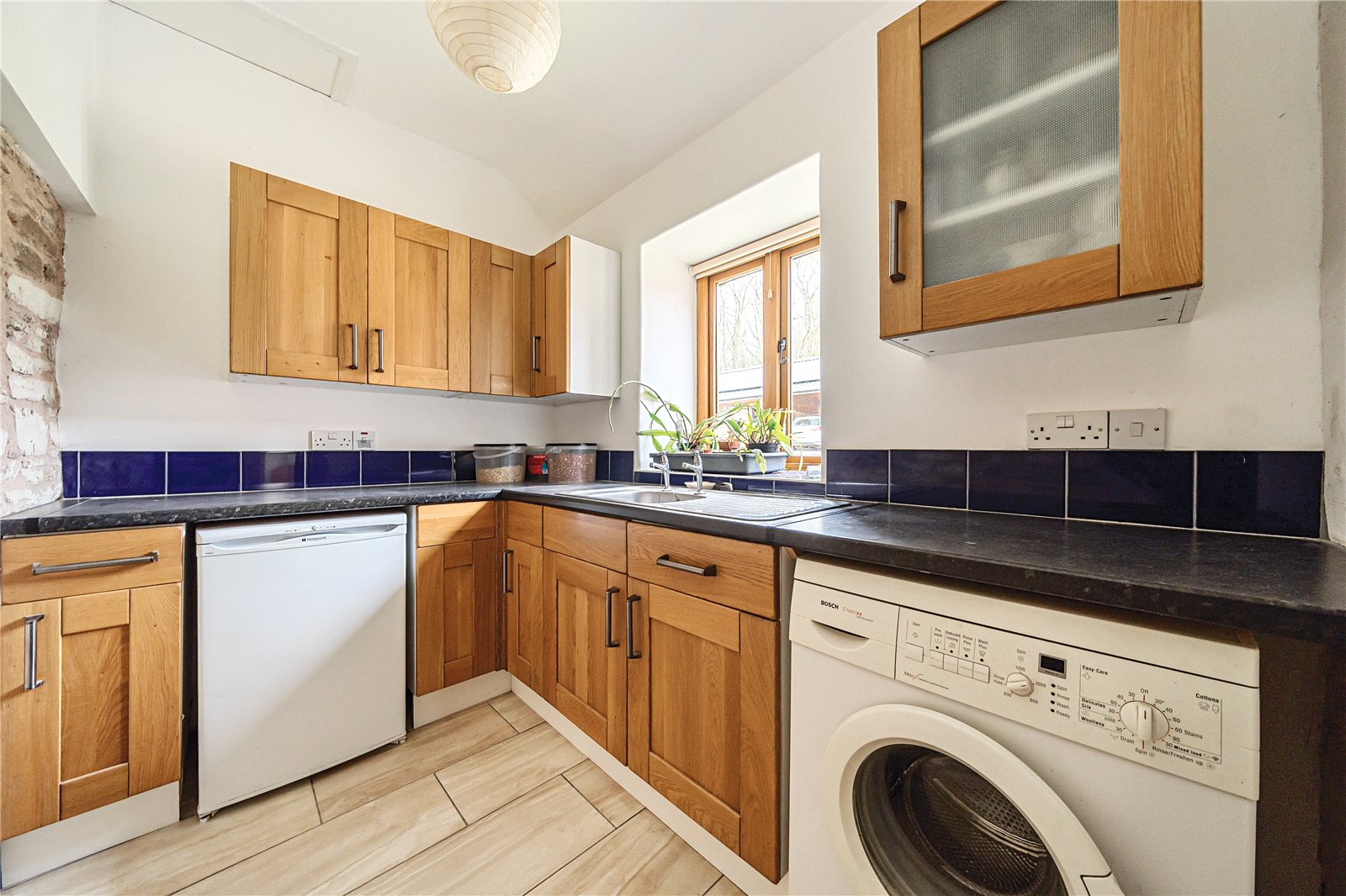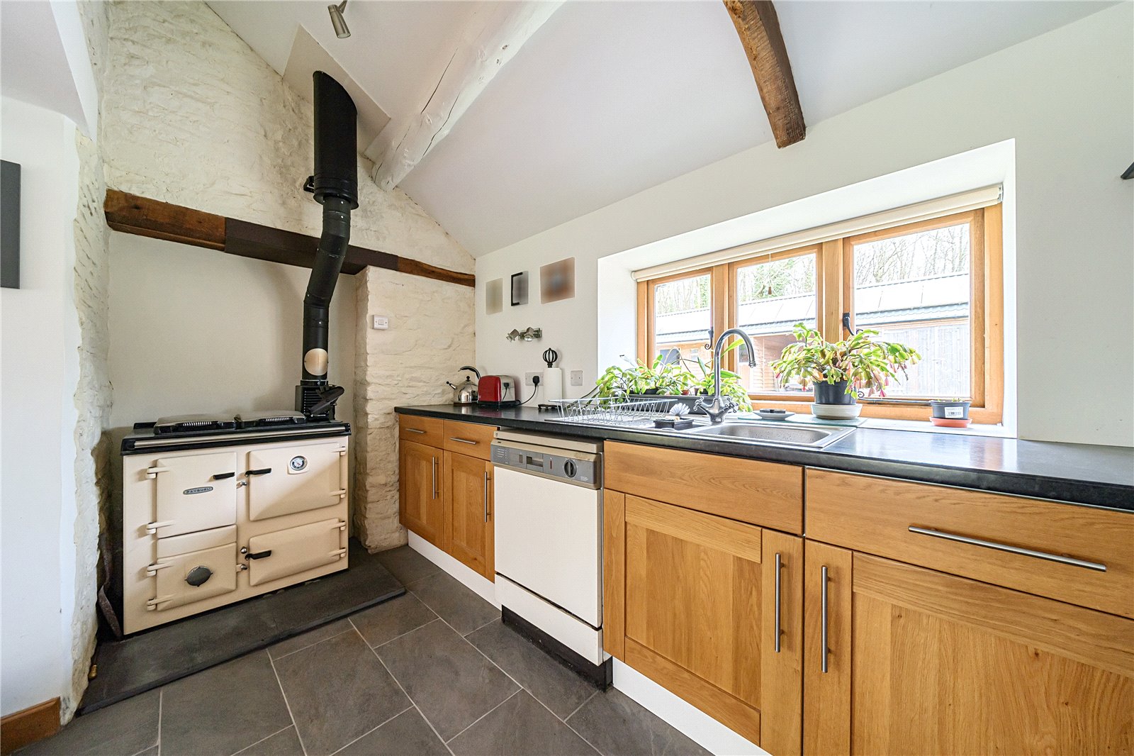 A glazed door leads to the stunning open plan Living/Kitchen/Garden Room. Extended by the current owner this is a flexible space with acacia solid wood flooring, part vaulted ceiling with double glazed skylight and full height double glazed windows and door opening to the gardens. Steps lead up to the Kitchen area with tiled floor, appointed with a range of base units with inset sink unit, plumbing for dishwasher, space for cooker with fitted extractor over, solid fuel Rayburn and wall mounted Worcester central heating boiler. A double glazed window overlooks the front courtyard.