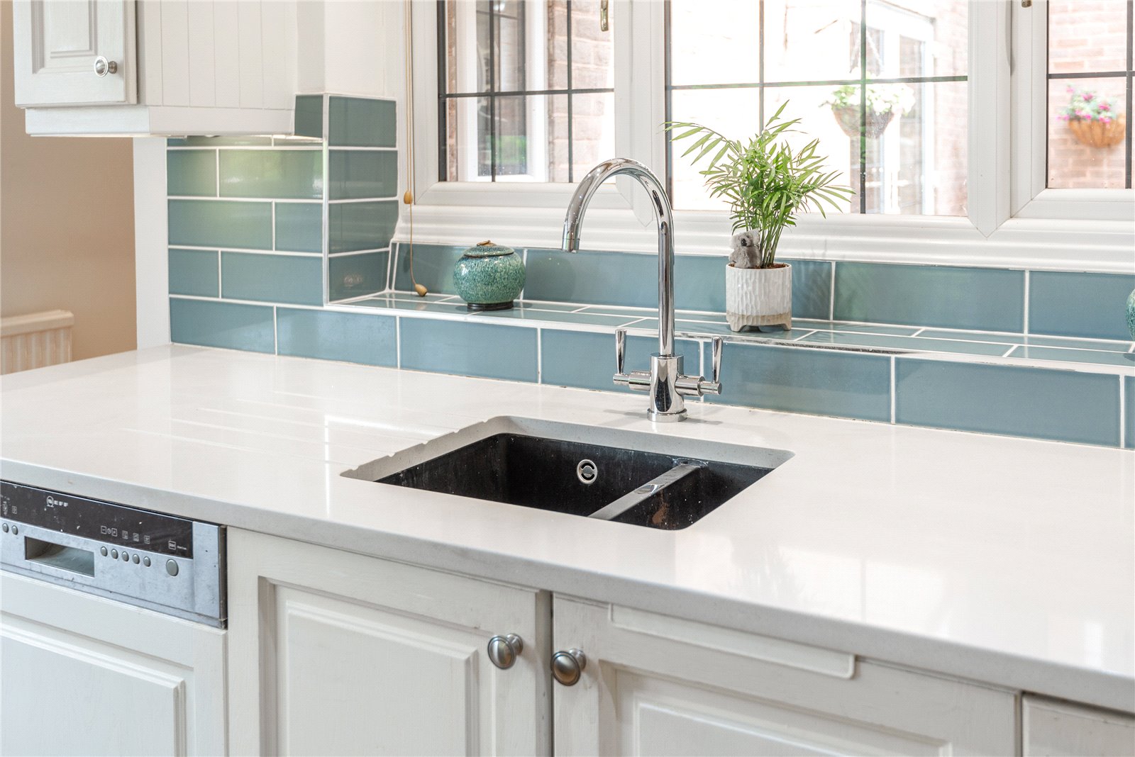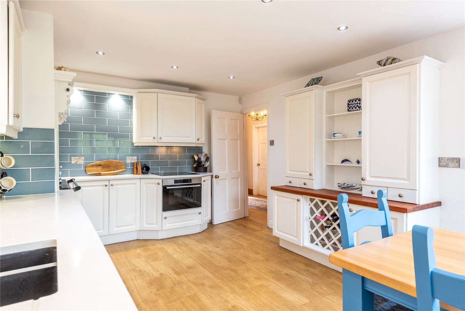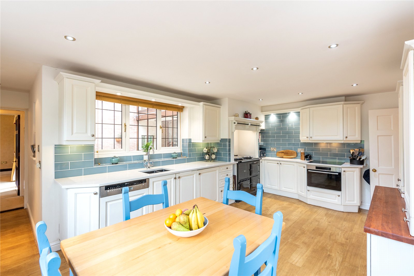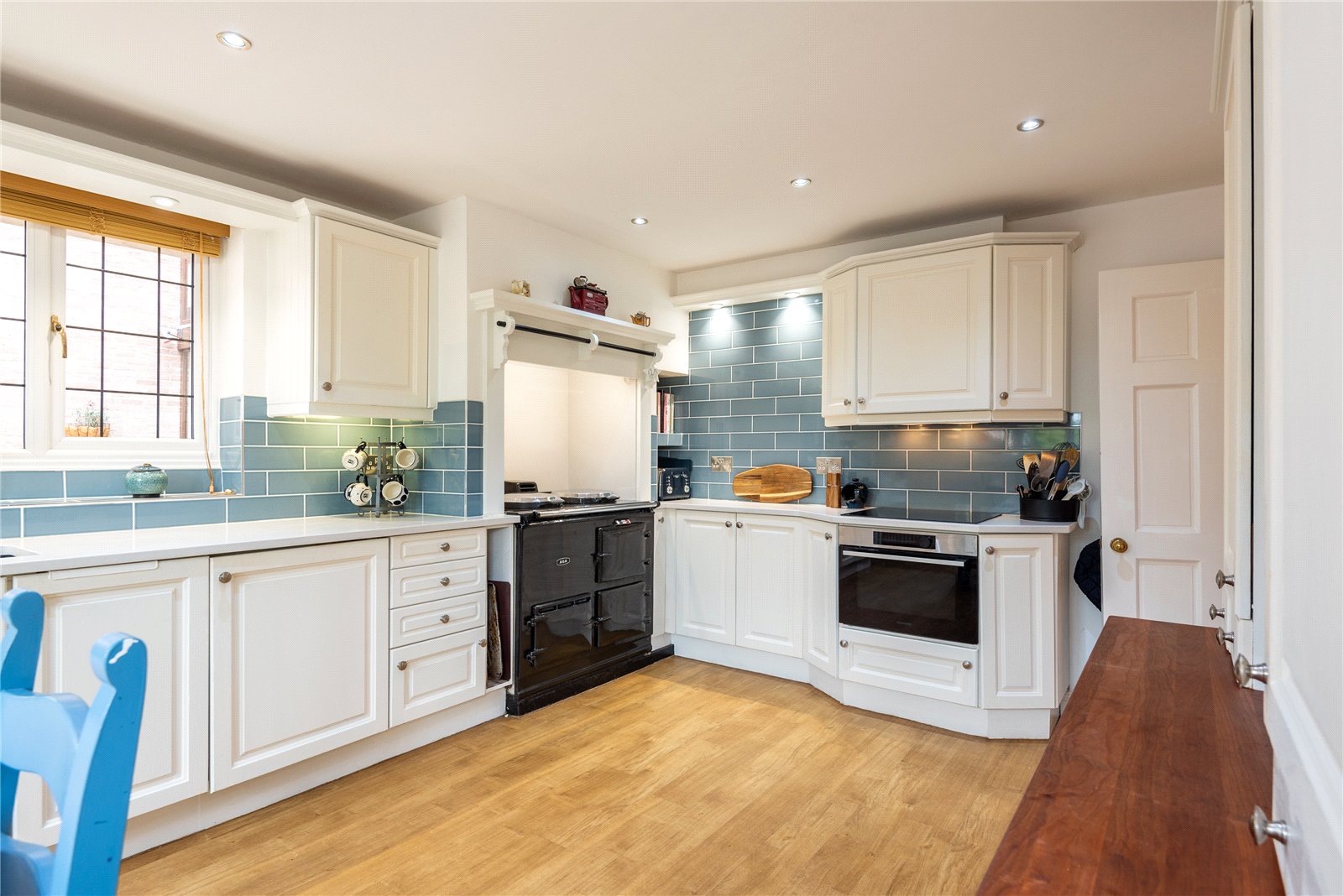 Tastefully fitted with a timeless countryside style. With a matching range of wall and base units of cupboards and drawers. Ample work surfaces. One and a half bowl sink and drainer with mixer tap. Integrated appliances include dishwasher, oven, air fryer, microwave and hob. Oil fired Aga. Amtico flooring. Recessed spotlights. Part wall tiled.