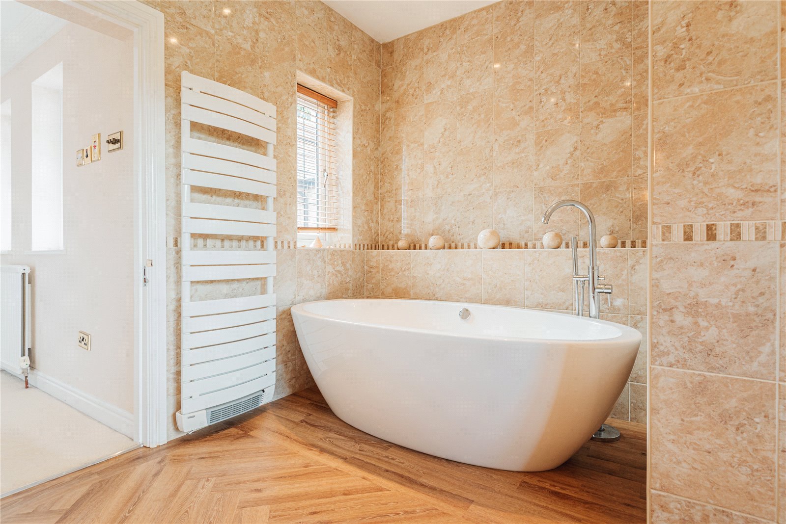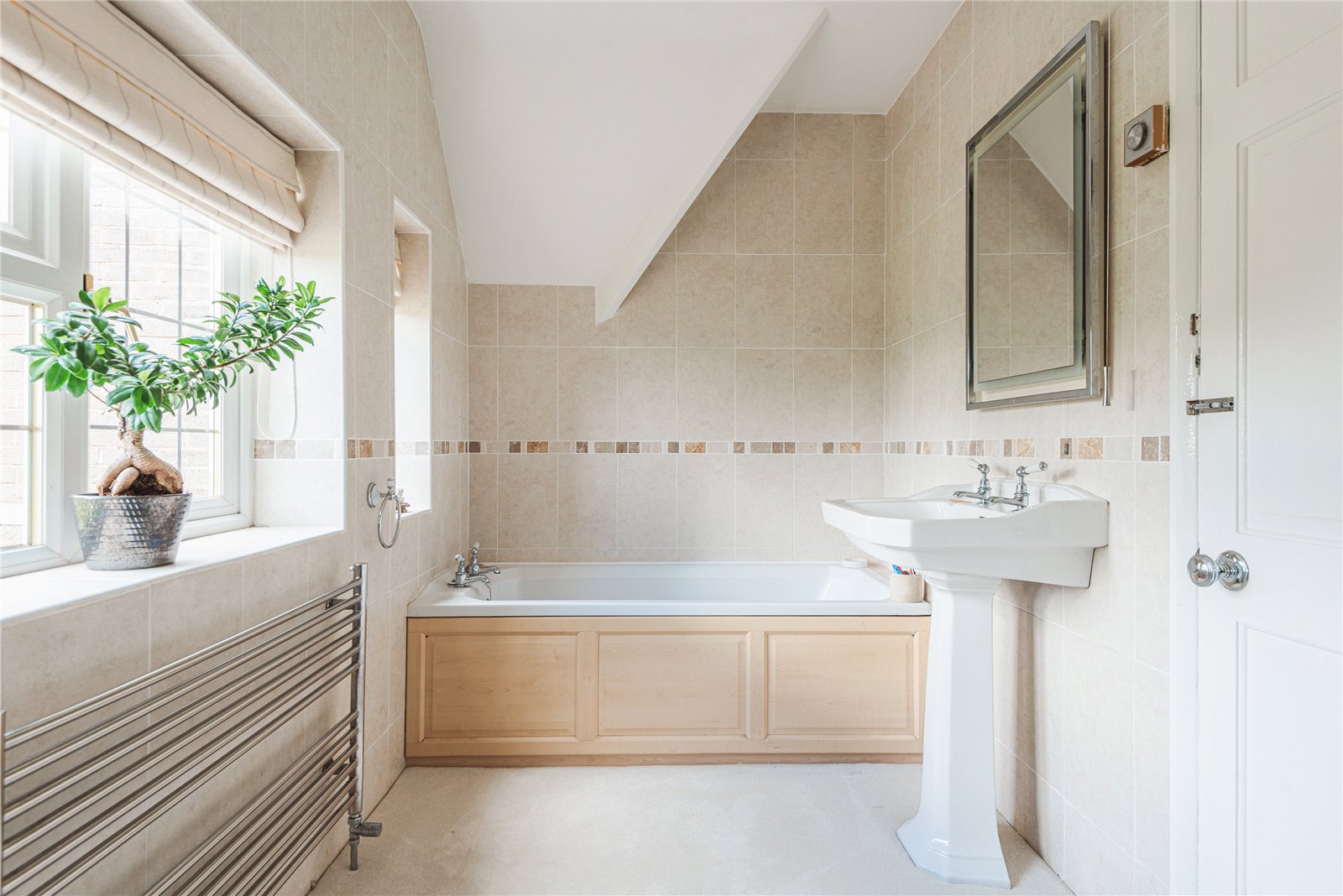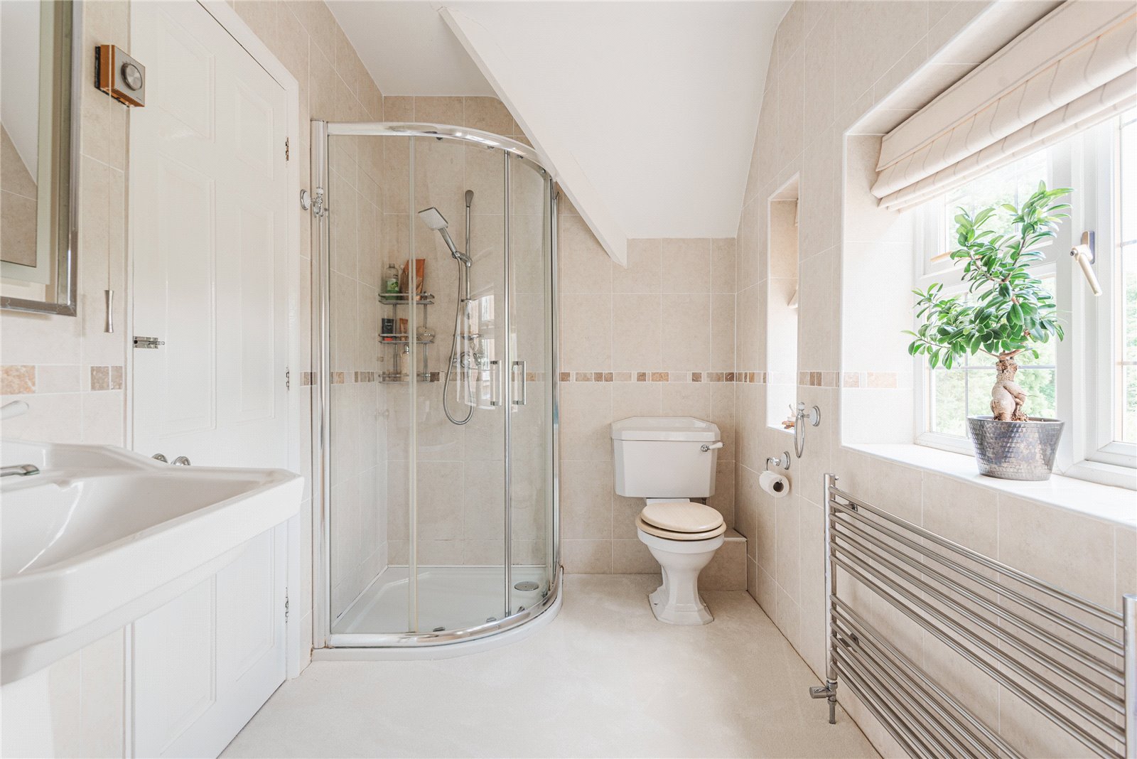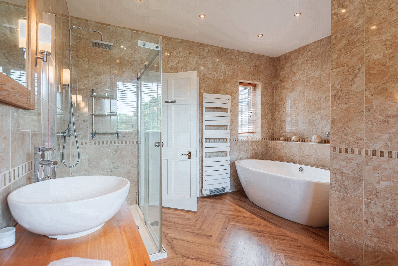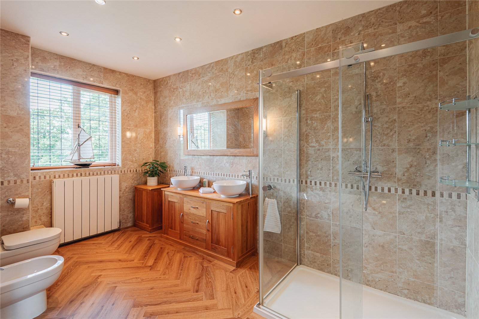 Fitted with a white Heritage suite and Merlin shower. Low flush WC. Panelled bath. Pedestal wash hand basin. Heated towel rail. Fully wall tiled. Recessed spotlights.