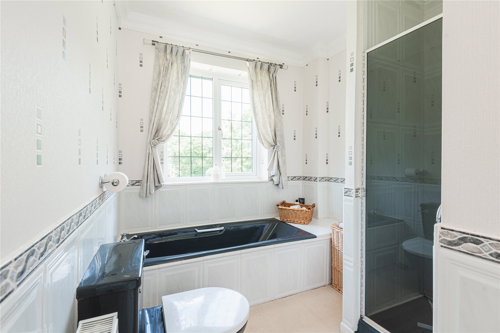 Fitted with a suite comprising an Italian oval bath. Bidet. Low flush WC. Jacuzzi shower on a stone tray. His & hers vanity units with inset wash hand basins. Fully wall tiled. Recessed spotlights