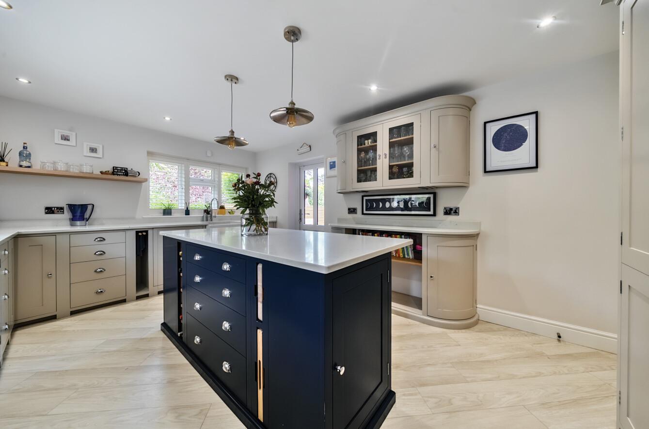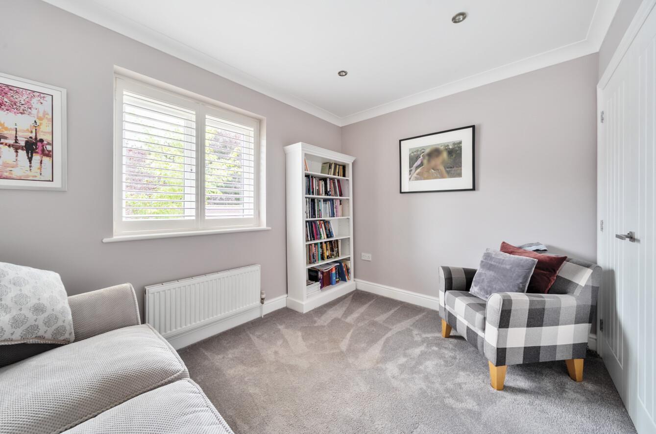 A welcoming entrance hall sets the tone for the accommodation ahead. The heart of the home is a superb triple-aspect kitchen/breakfast room, featuring a handcrafted Neptune kitchen with high-specification appliances, a space designed for both everyday living and culinary creativity. The separate dining room, enhanced by a bespoke bookcase showcasing fine craftsmanship, lends itself equally to formal occasions and relaxed dinners. The sitting room is a tranquil retreat, centred around an elegant fireplace and featuring bi-folding doors that open onto a decked terrace, extending the living space seamlessly into the garden. A dedicated study with bespoke fitted furniture provides an ideal work-from-home environment, and a downstairs cloakroom completes the ground floor.