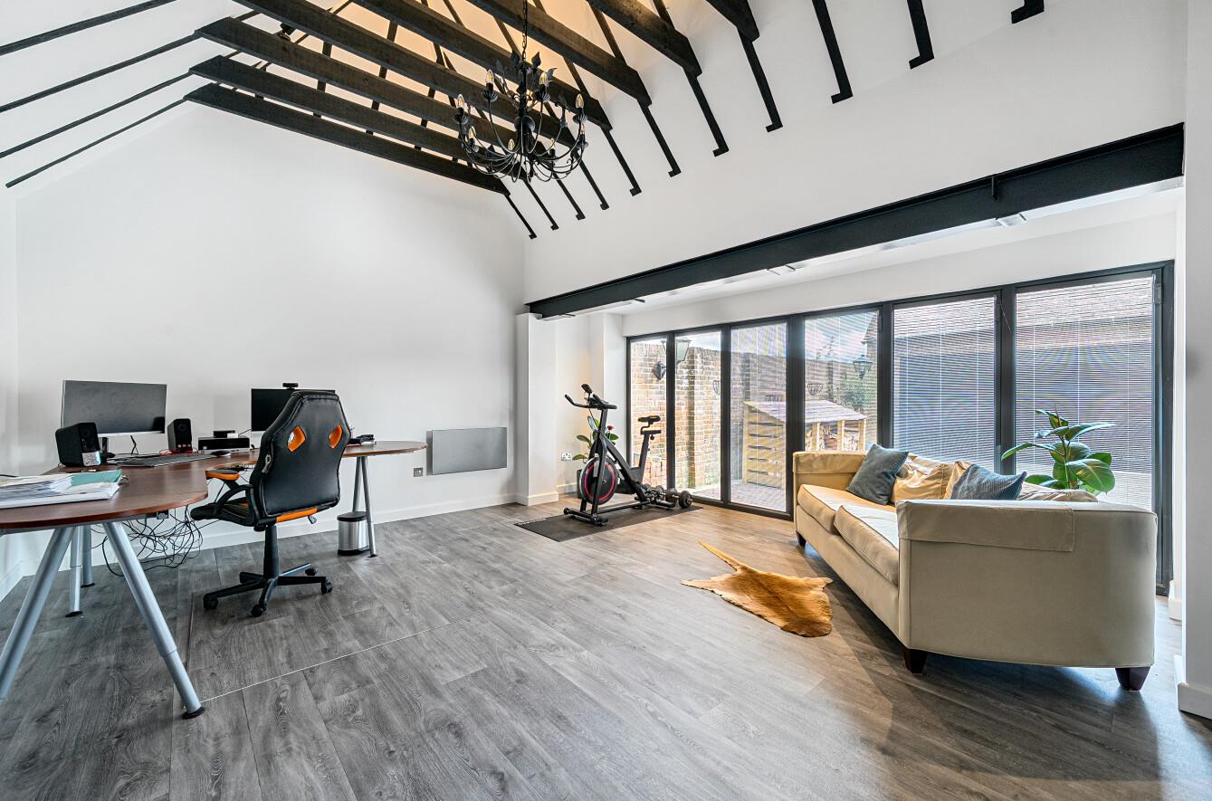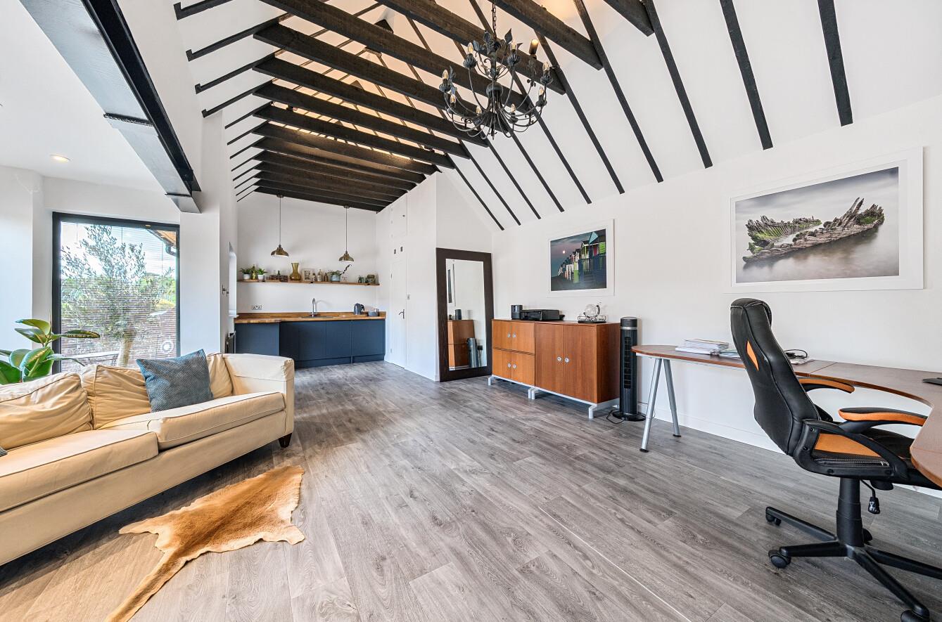 The detached annexe is a triumph in its own right. With its soaring vaulted ceiling, fitted kitchen, and sleek shower room, it provides an inspiring space - ideal for visiting guests, multi-generational living, or even income generation through short-term letting. Premium windows with integral blinds add both style and privacy, while the sense of light and air gives the space real wow factor.