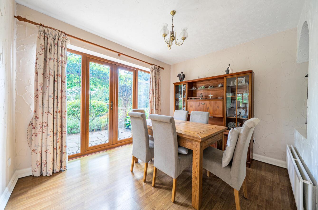 Inside, the home unfolds across four distinct levels. The main living spaces sit at the heart of the home, with a spacious reception room and separate dining room both looking out onto the gardens. A central staircase connects these areas with the upper and lower levels, creating a fluid yet defined sense of space. To the rear, a light-filled kitchen with ample work surfaces and storage opens into a bright study area, a pleasant vantage point over the garden and an ideal space for home working or casual breakfasts.